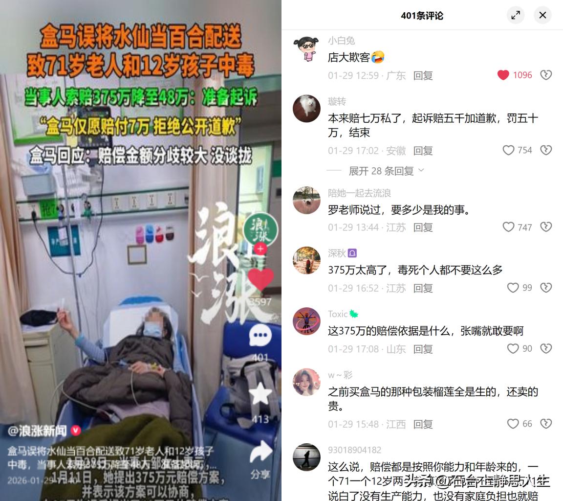 水仙混进食用百合,老人孩子中毒 某生鲜平台误将观赏水仙当食用百合配送,致老人孩子中毒住院。消费者索赔从375万降至48万并要求道歉,平台只愿赔7万打包款还拒绝道歉,双方谈崩要起诉。 这事儿看着是分拣失误,实则暴露了生鲜行业两个暗疾。 一是品控的部门墙漏洞。观赏植物和食用生鲜本该完全隔离,能混到餐桌,说明平台品类隔离机制是摆设,靠人眼分拣而非系统+流程把关,把用户安全赌在员工细心上,本质是管理偷懒。 二是大企业的维权套路。375万确实偏高,但48万对照类似判例里老人儿童中毒的20-60万合理区间,也是有依据的。可平台上来就给无明细的7万还不道歉,这是降维压制:用低额赔付消磨耐心,用狮子大开口污名化合理诉求,潜台词就是耗不过就认栽。 品控漏洞的代价,凭什么让消费者承担?合理维权,就只能在认栽和被骂贪心里选吗?