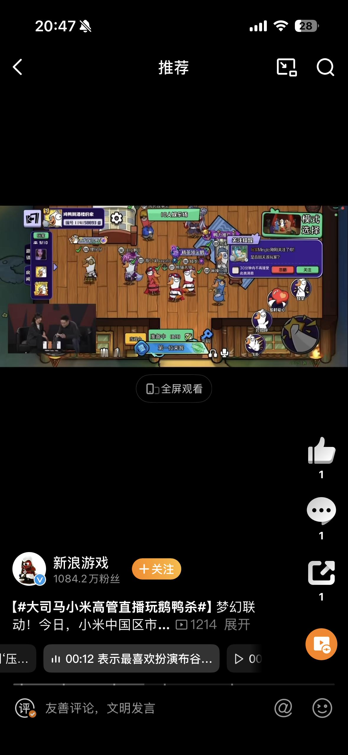 小米的经理老魏做客大司马直播间,一起直播玩鹅鸭杀了,最近这个游戏好火啊,你们玩了嘛,看了一下挺有意思的,有空了去玩玩!大司马小米高管直播玩鹅鸭杀小米高管直播玩鹅鸭杀
