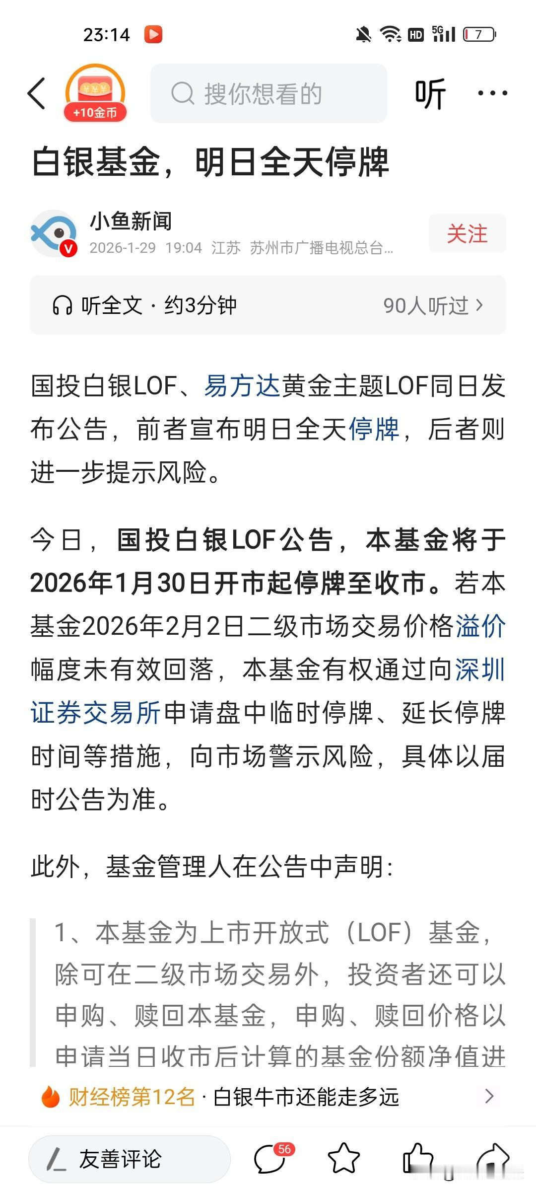 国投白银LOF,易方达黄金主题LOF宣布明日全部停牌!这就是限制申购白银,黄金基金了,如果价格不回落,就延长停牌。市场其实没什么风险,看看2007年那波有色大牛市,云南铜业翻了几十倍,也没提醒什么风险啊!白银也就翻了几倍而已,停牌解决不了任何问题,白银的定价是华尔街,不是基民,基民只是冲进去买,赚个差价而已。想不明白,为什么要人为干预市场呢?