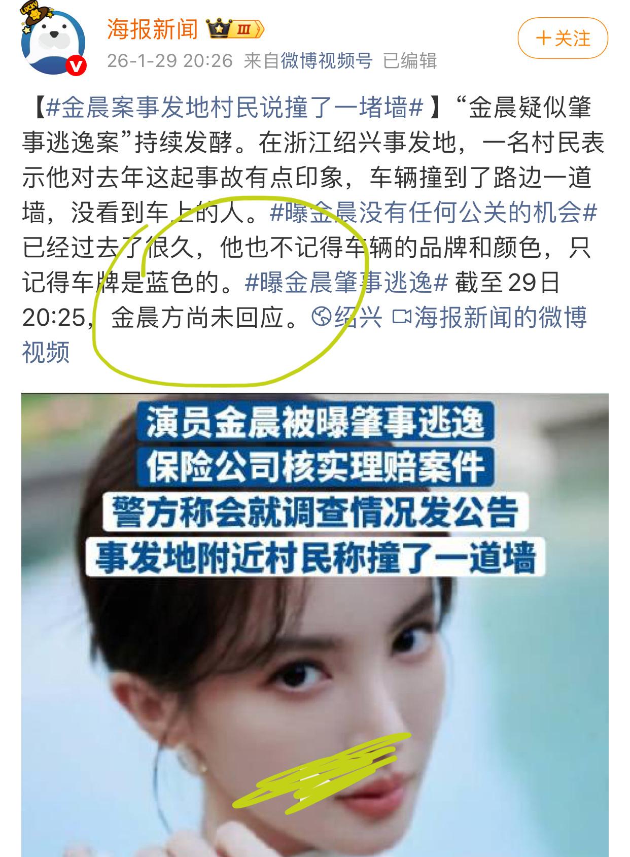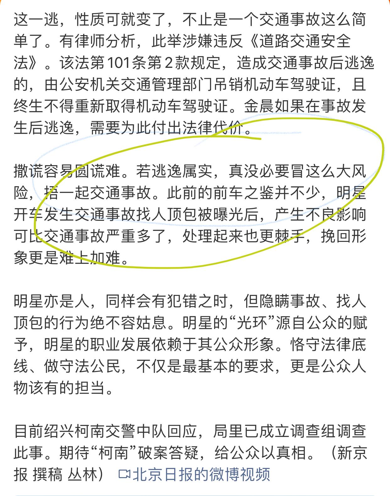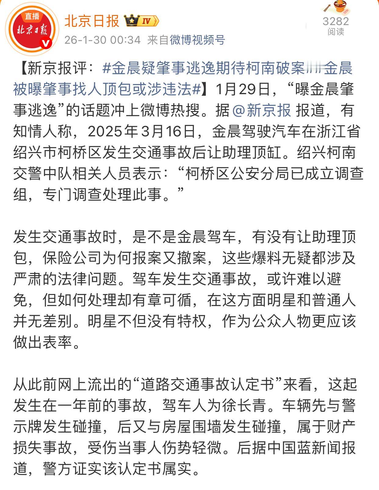 金晨涉嫌肇事逃逸,这个事情果然是闹大了。 连北京日报这样的官方媒体都开始点名说了。 其实这个事情本来不大,单方面出事故,又没撞人,只是撞墙了,不涉及什么大的损失,作为大明星,赔点钱就完事了。 但不知道怎么金晨非得闹成这样,一旦坐实她肇事逃逸的话,那金晨真的是要被封杀了。 毕竟娱乐圈,绝对不允许有违法的艺人。