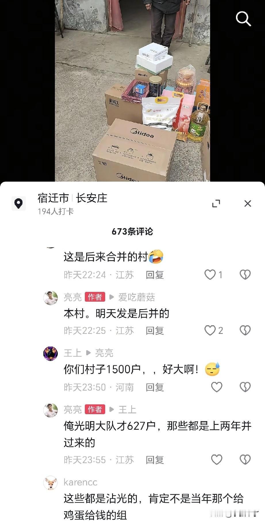 1月29号,江苏光明村的“亮亮”晒出收到刘强东送的年货,分别:米,面,油,酒,微波炉,手机,电热毯…另外还透露了冷知识,让网友了解到很多事情。 比如,这次发年货总共涉及1500户,但是先发放的是627户,也就是说,这些才是当初送鸡蛋捐钱的人,而后边发放的都是前几年合并过来的。从中也能看出,刘强东格局大,既然过来了,那就一视同仁吧[灵光一闪]。 年货是根据户口本来分,这次网友“亮亮”拿了两份,一份属于自己家庭,一份属于父母。 很有网友表示说:这个村的男生肯定吃香,女生做梦都想嫁过去。不过“亮亮”回复说:目前光棍不少。也就是30多岁还没结婚的很多,其实婚姻不单单看物质,还有脾气,性格多种因素。 虽然网上视频看,都是二层别墅,但“亮亮”说:全村并没有都拆完,还剩下几个小组保留了老房子,虽然没说明原因,但小编感觉不可能因为资金问题,估计有些村民不愿意吧。 别的不说了,实在羡慕呀[爱慕]。