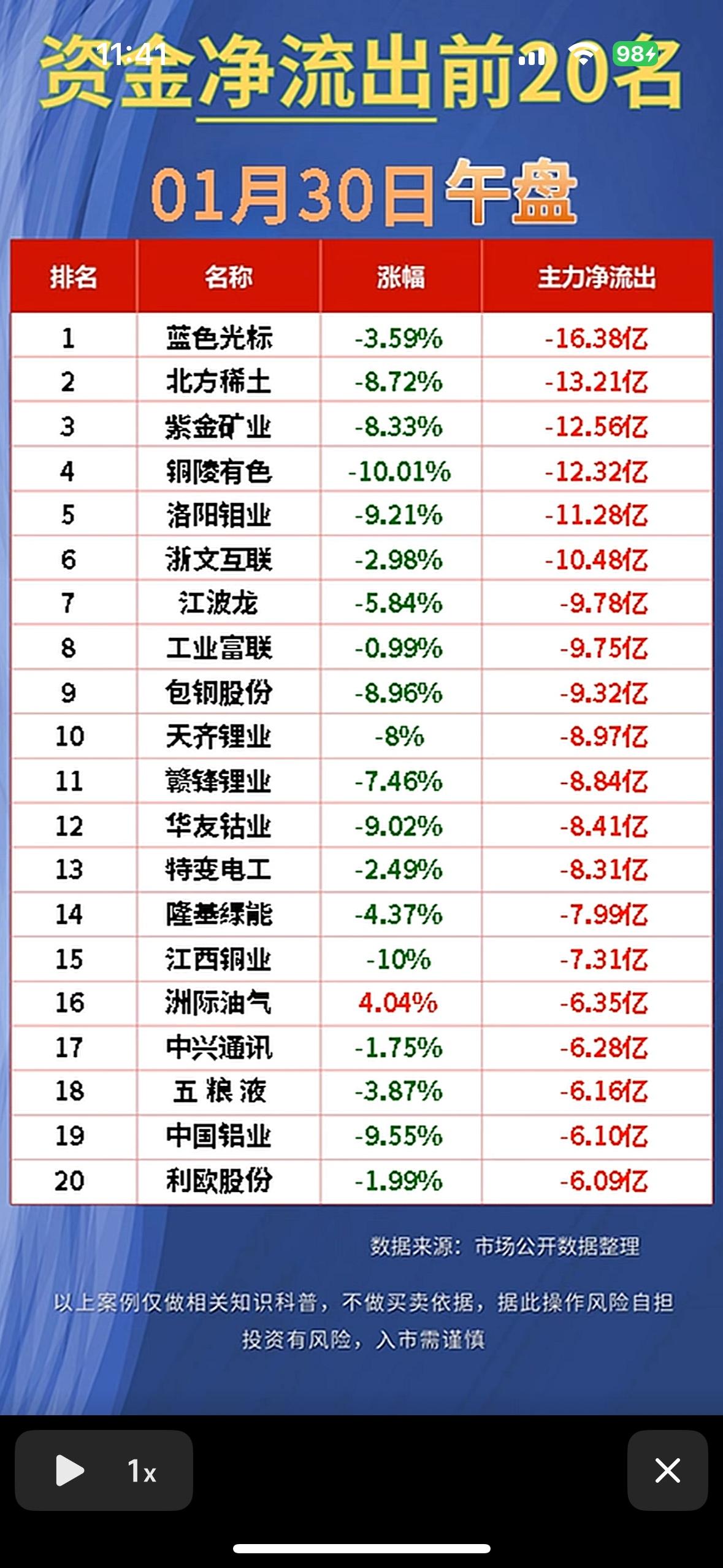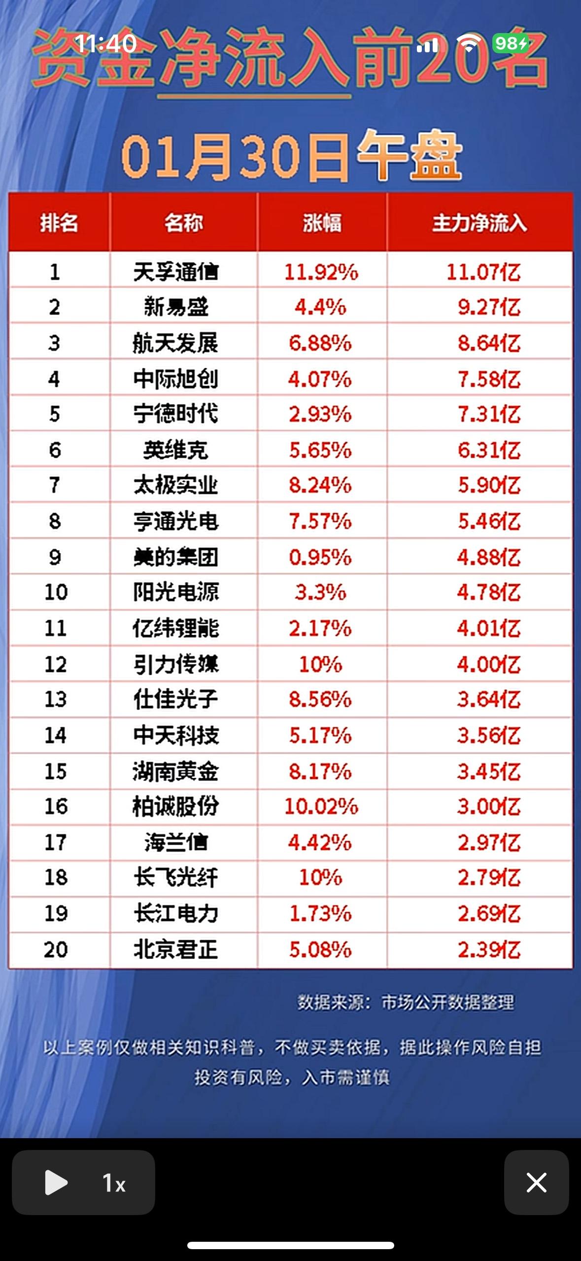 “1月30日午盘资金净流入前20名,天孚通信领涨!”📈💰 科技股领涨资金流入榜,通信、能源板块受热捧,主力抢筹势头强劲,市场交投活跃需谨慎。