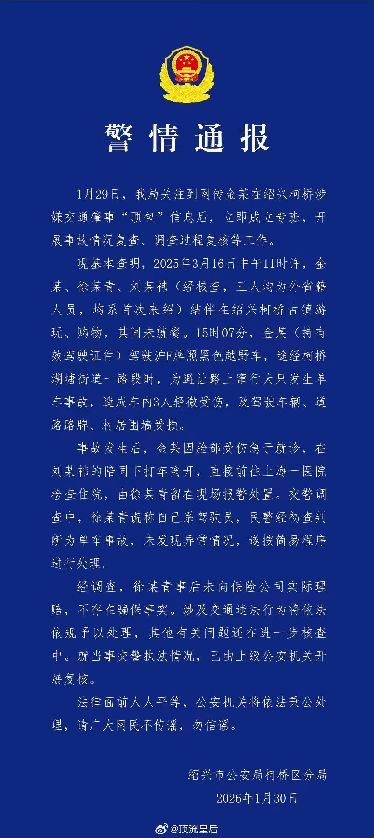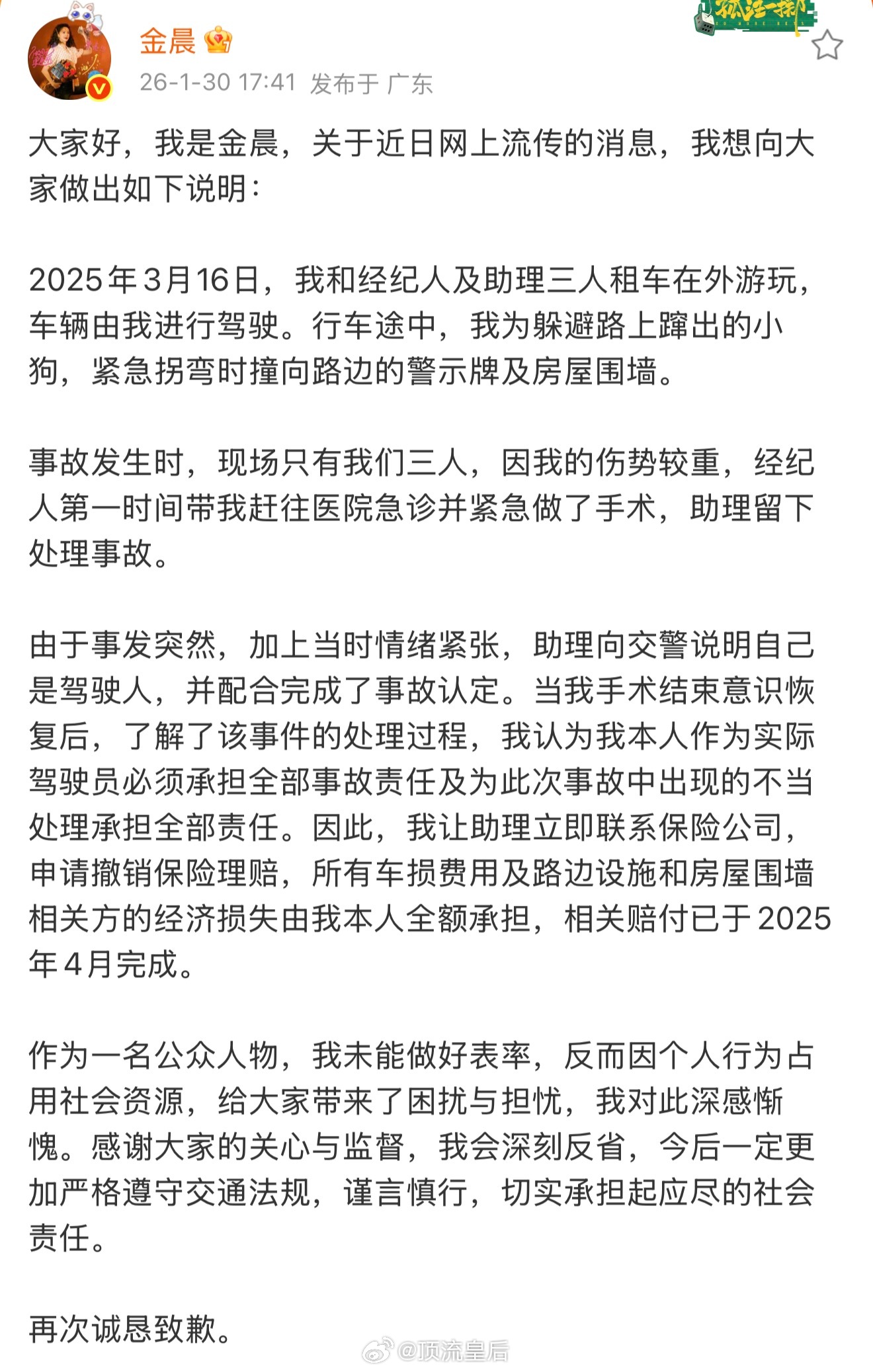 警方通报金晨事件金晨道歉看了警方对金晨事件的通报,感觉就是一个简单的交通事故,