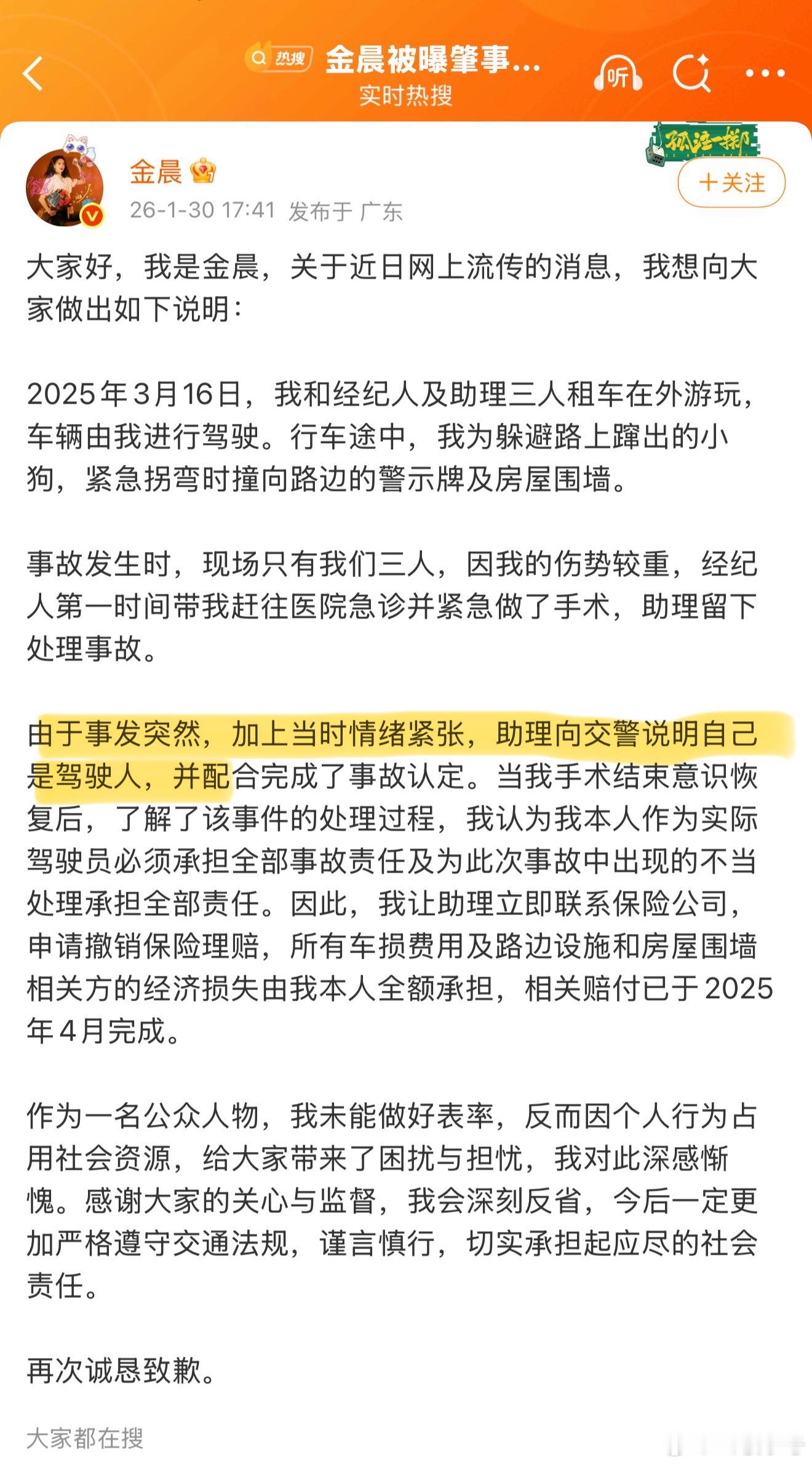怎么看金晨的回应 「加上当时情绪紧张,助理向交警说明自己是驾驶人」
