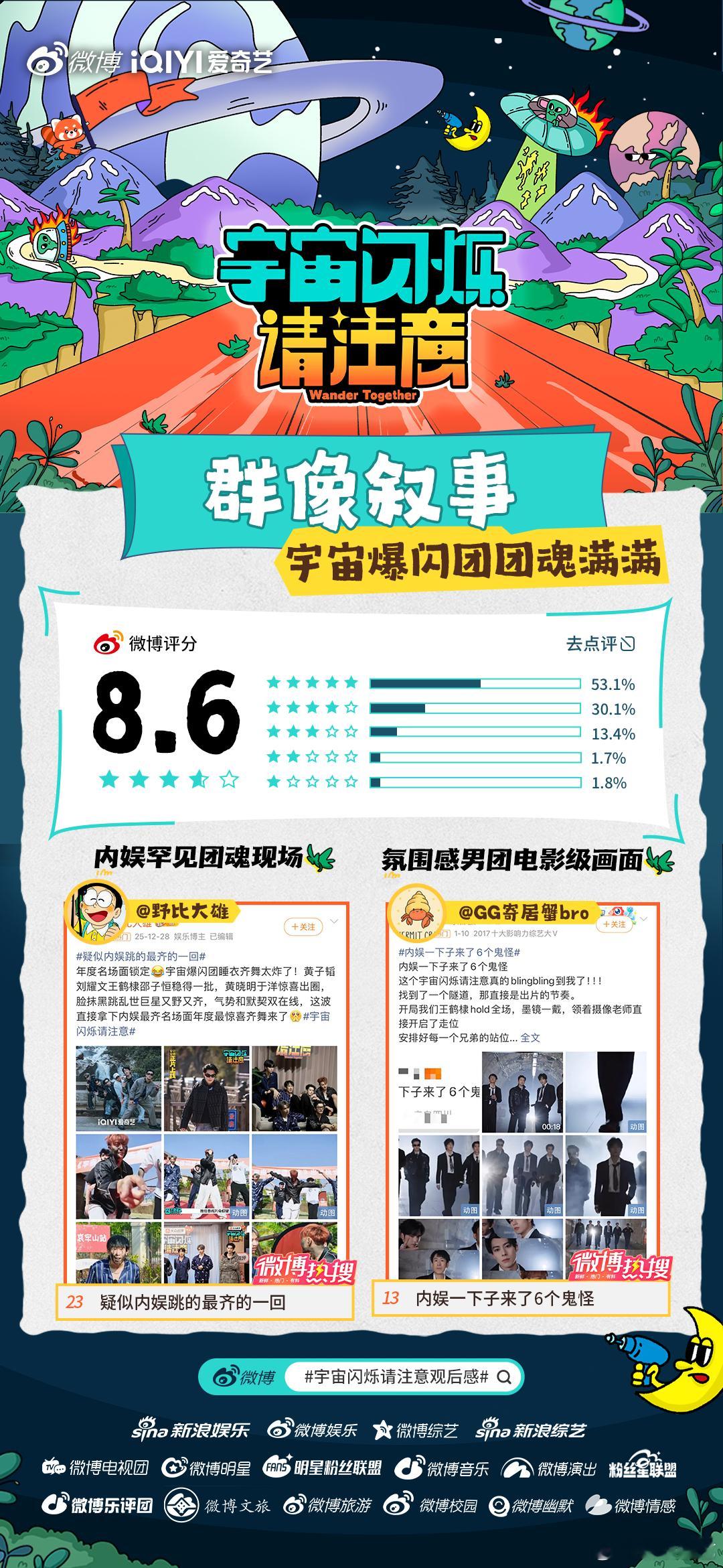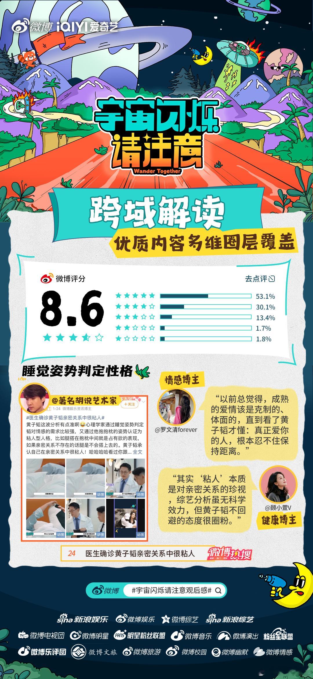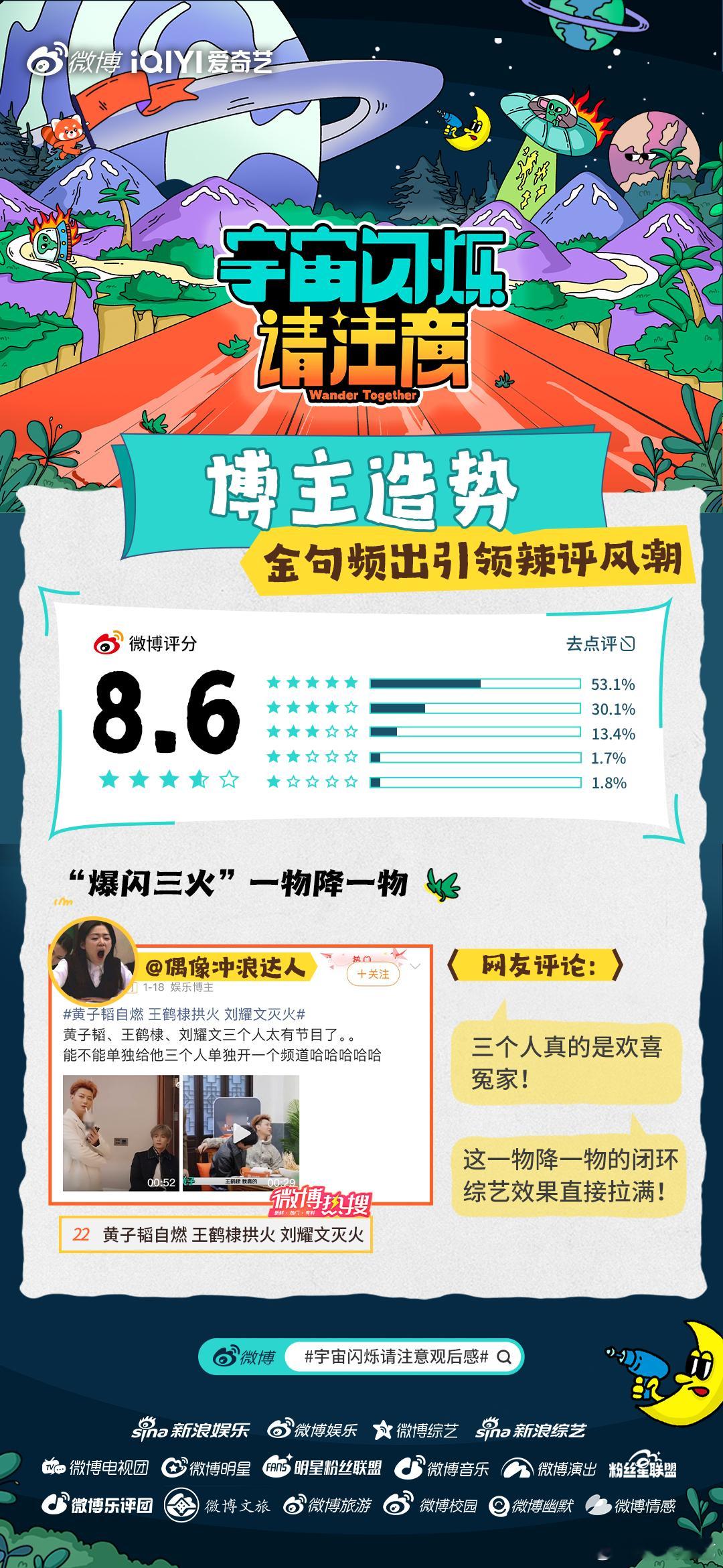 宇宙闪烁请注意微博开分8.6爱奇艺新综艺《宇宙闪烁请注意》微博开分8.6💥名场面频出爆梗不断,爆闪团成员高频互动将抽象进行到底!跨域解读、博主造势、网友热议……你都看了哪些印象深刻的名场面?