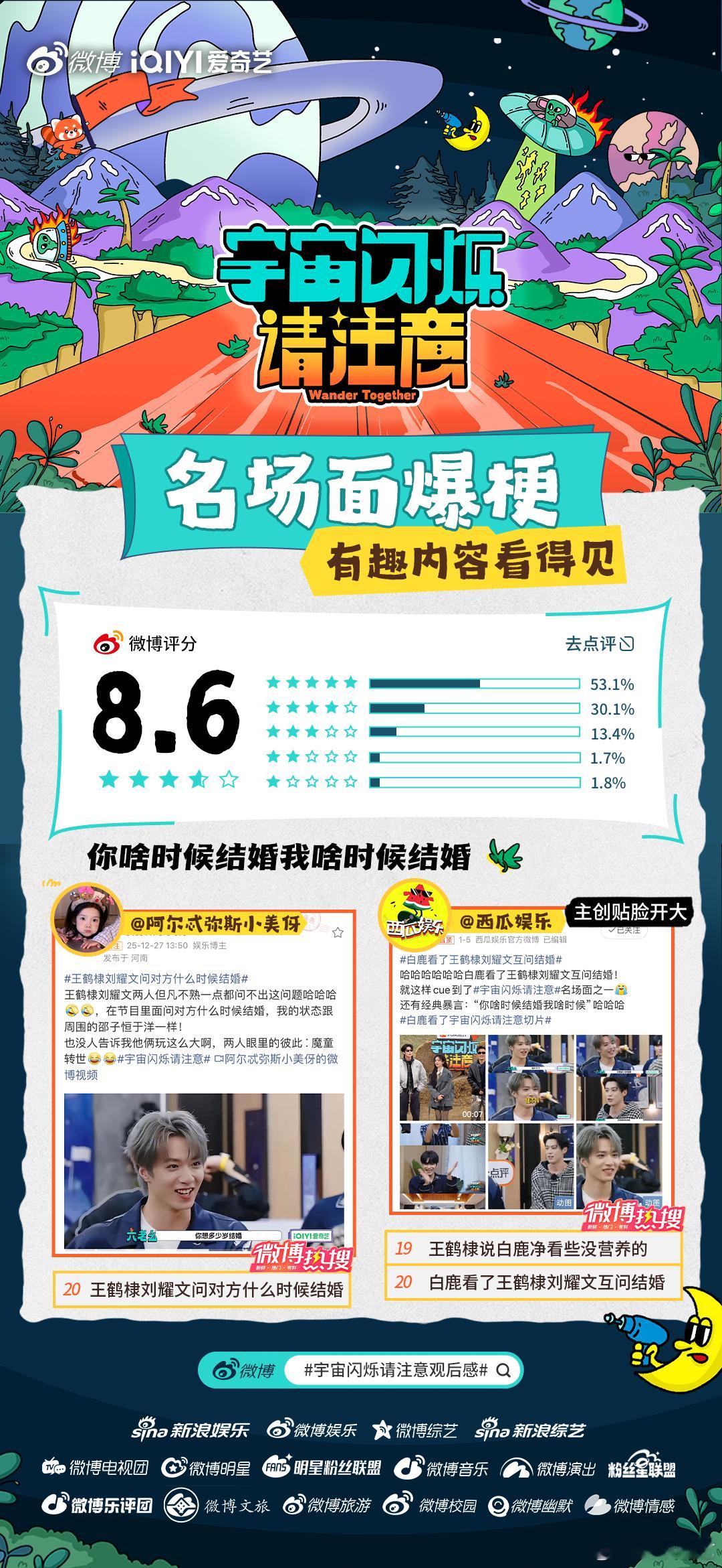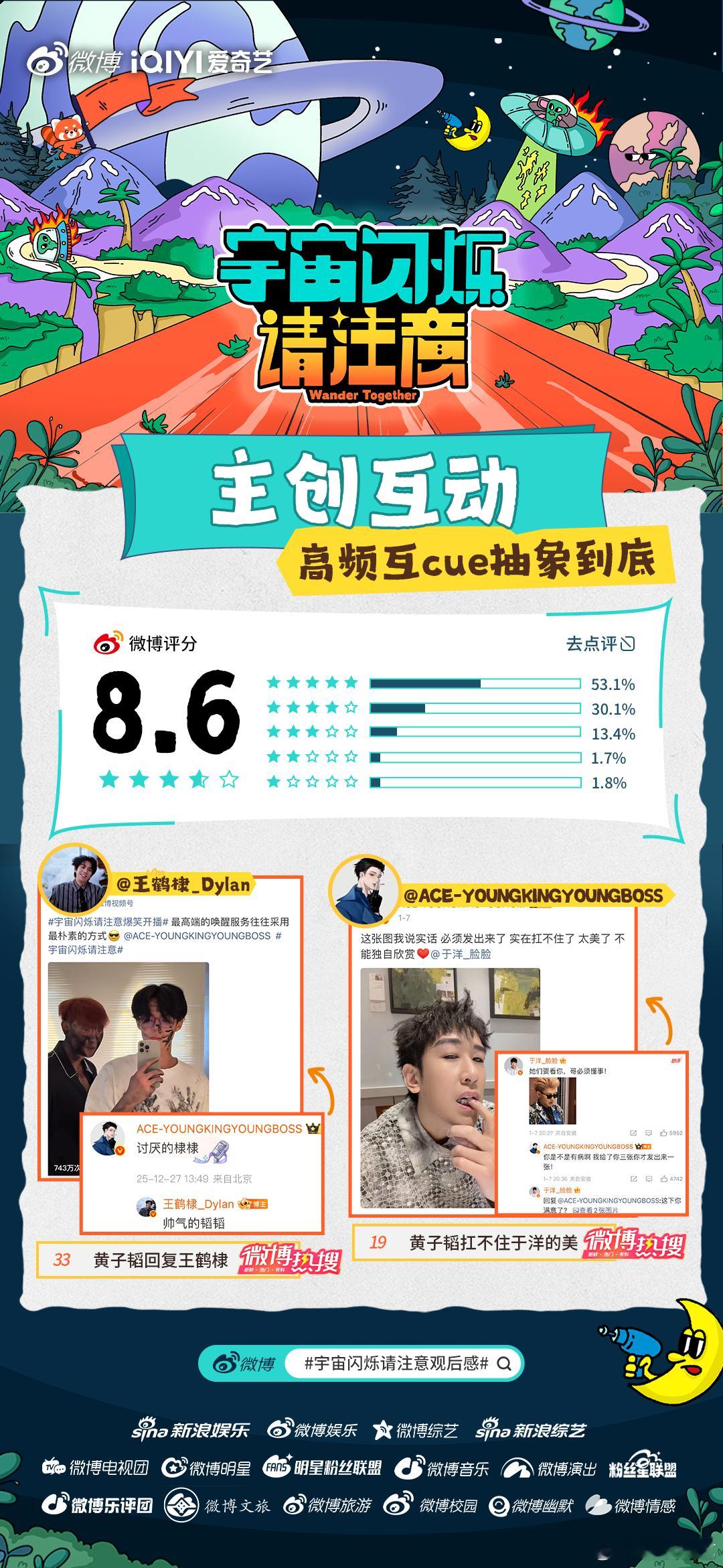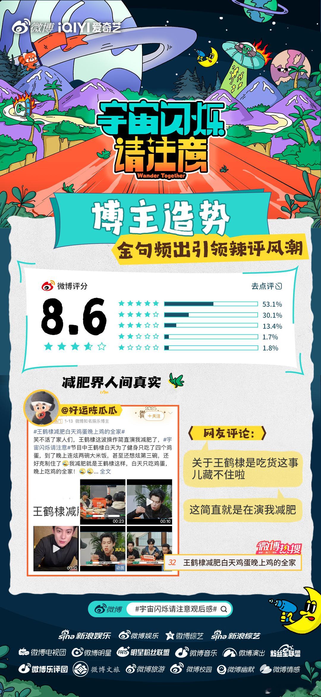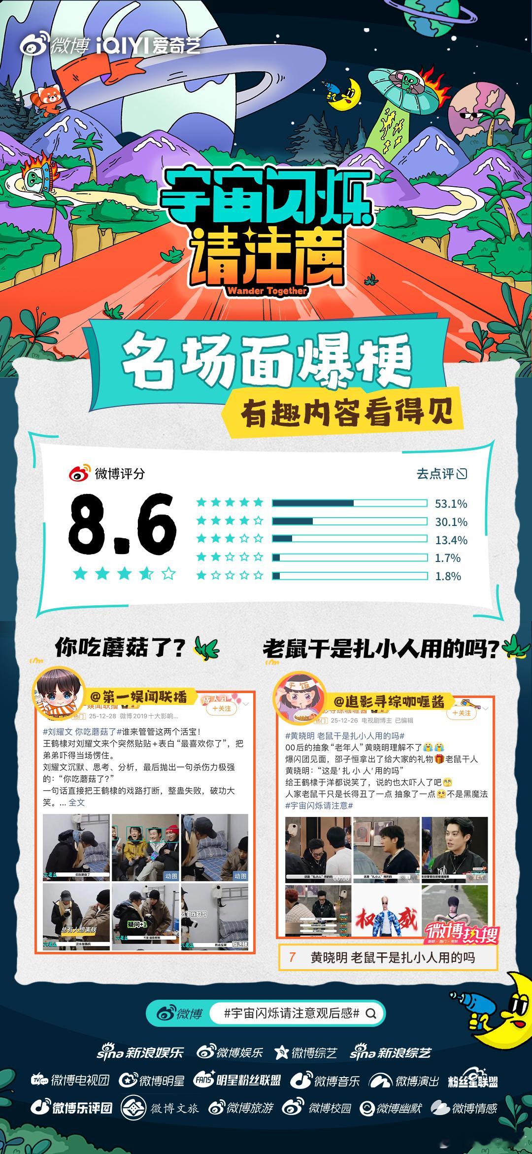 宇宙闪烁请注意微博开分8.6爱奇艺新综艺《宇宙闪烁请注意》微博开分8.6💥名场面频出爆梗不断,爆闪团成员高频互动将抽象进行到底!跨域解读、博主造势、网友热议……你都看了哪些印象深刻的名场面?
