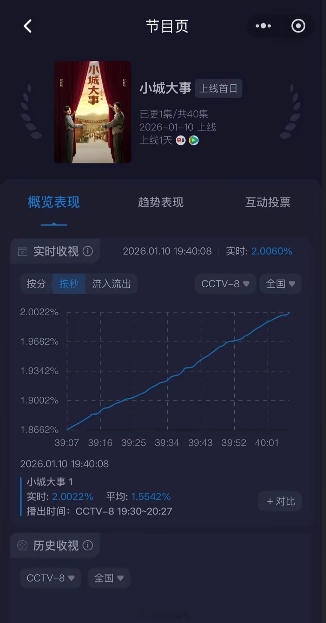 《小城大事》首播平均收视2.2348%,峰值 2.63%、开播10分钟酷云破2、15分钟登顶全频道第一。 台网双爆,开年第一爆,口碑收视双丰收。牛比!