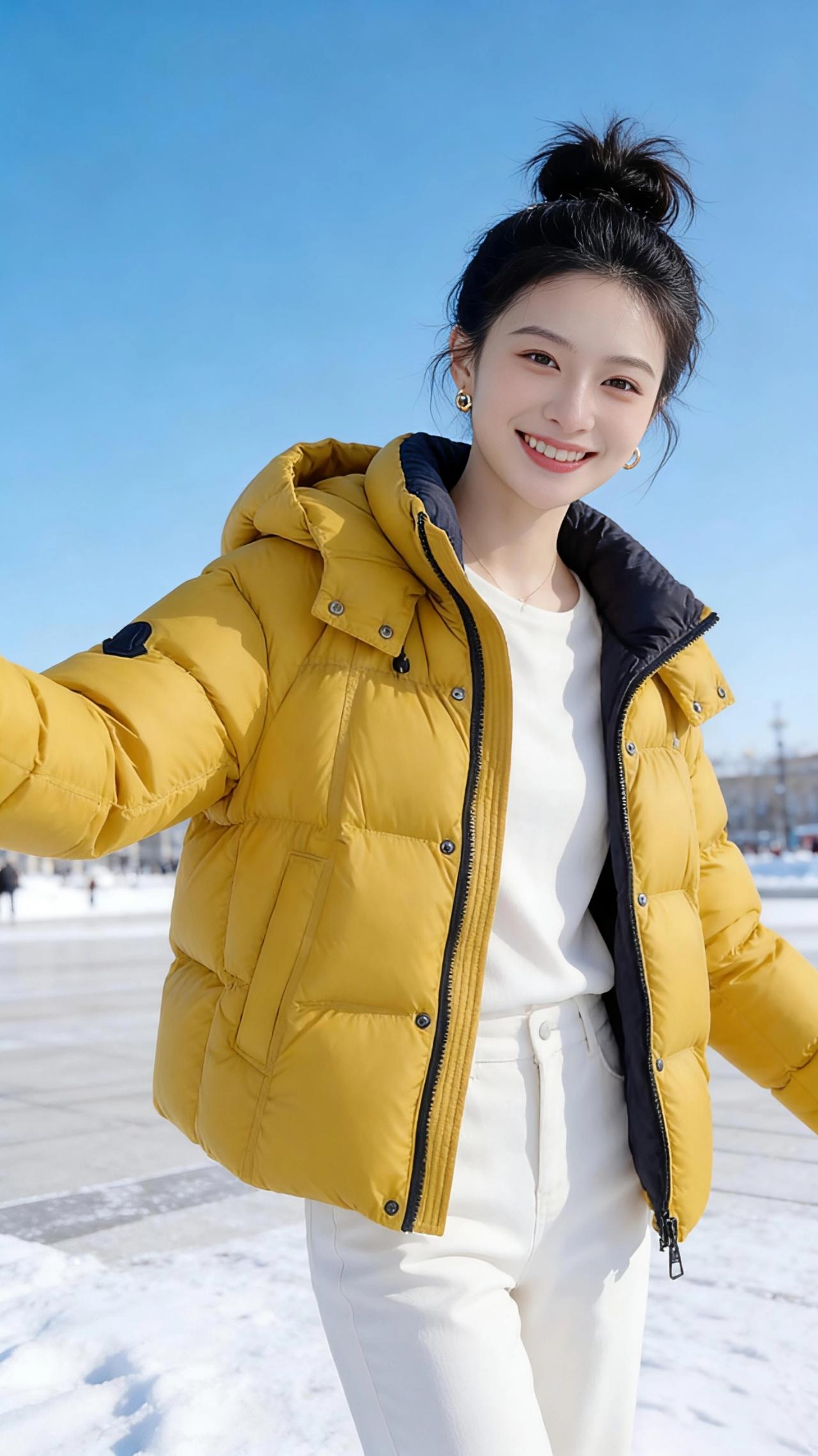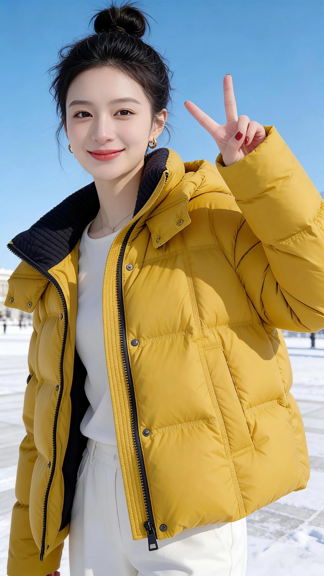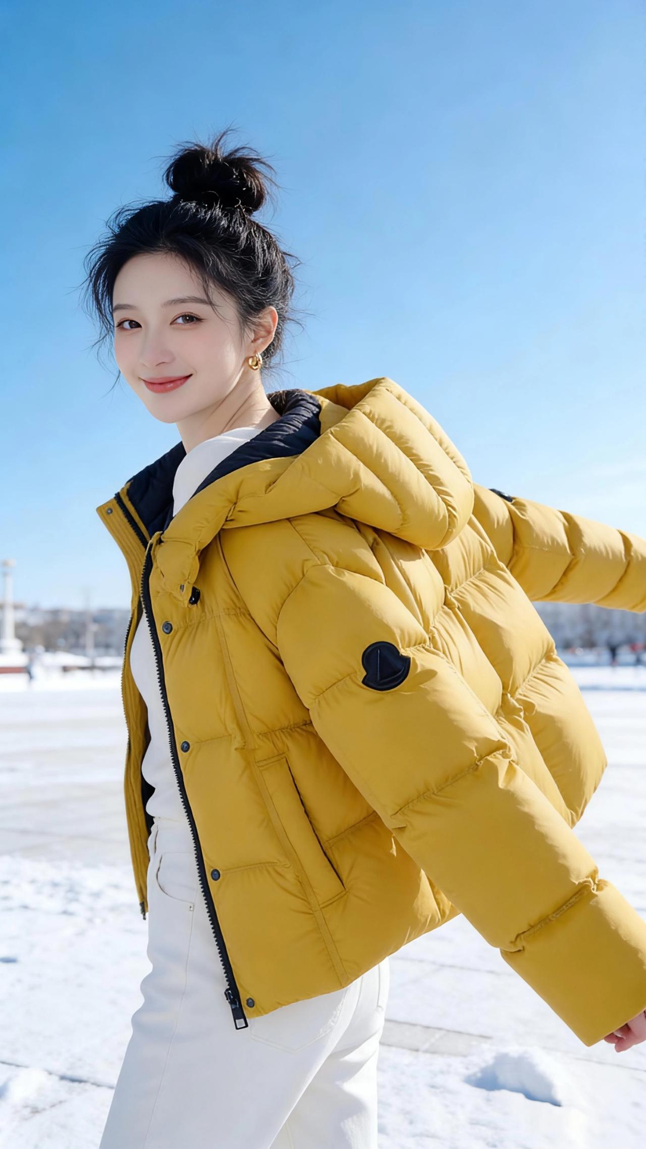 冬阳里的黄棉袄 雪后的广场,像一块被阳光擦亮的玉。澄澈的蓝天低得仿佛触手可及,风里裹着碎碎的雪粒,落在颈窝时却带着一丝温柔。 她立在这天地间,像一团被冬阳焐暖的光。蓬松的丸子头沾了点细雪,发梢亮晶晶的,衬得一张脸愈发白皙。姜黄色的羽绒服蓬松柔软,像把整个秋天的暖阳都揉进了衣料里,黑色的领口在明黄里撞出利落的层次,随着她抬手的动作,衣摆轻轻晃着,漾起一圈暖意。 她笑着,梨涡浅浅,伸手比出一个轻快的“V”字,阳光顺着羽绒服的纹路漫开,把绒面烘得暖融融的。偶尔侧身时,衣摆扫过雪地,惊起细碎的雪沫,她便笑着旋开去,像一只在雪光里振翅的小黄鹂。 这不是刺骨的寒冬,是被一件暖衣、一抹笑靥焐热的冬日。她站在雪与光的中央,让凛冽的风都变得温柔,让路过的人都忍不住放慢脚步,想把这团鲜活的暖,也揣进自己的冬日里。 高级感穿搭 冬季穿搭 新年穿搭 棉衣棉服