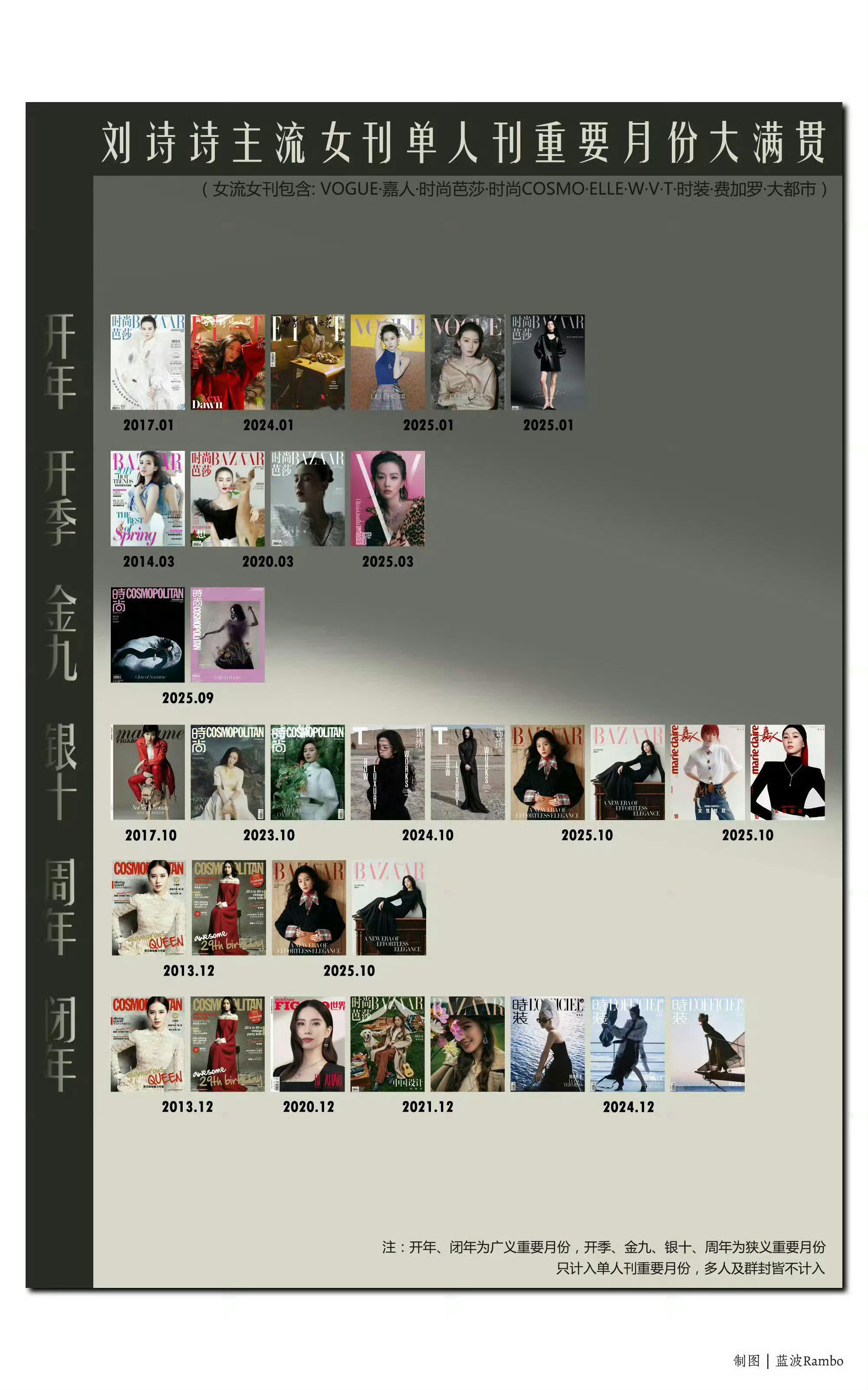 其中刘诗诗主流女刊重要月份(只统计金九银十开季周年),共7刊内地➕3刊港版,目前85花top: