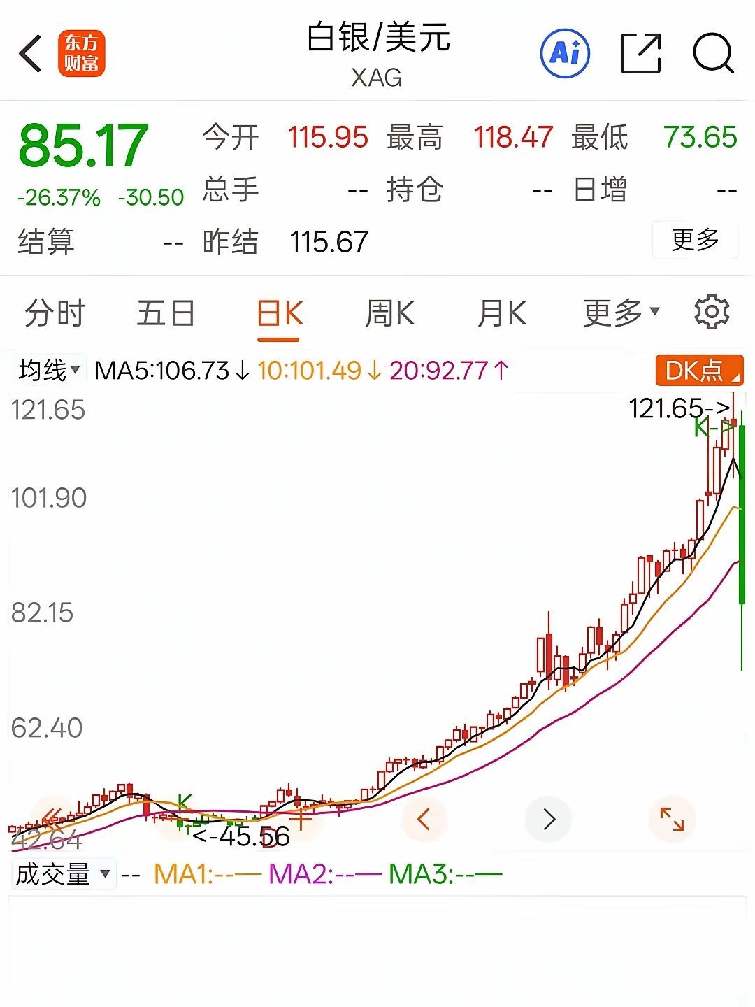 白银暴跌26.37%!今夜天台人满为患,都在排队吹晚风家人们,白银这波跳水,比我妈催我找对象还急!短短两天从121.65直接干到最低73.65,收盘85.17,这哪是跌,这是开了加速挂往下冲!前几天还在群里喊“梭哈!上看300!”的老哥,现在头像灰了,朋友圈也停更了。满仓杠杆的兄弟,现在手机里的爆仓短信,比过年的祝福还多。 市场这镰刀磨得也太快了:白天刚给你画了个“财富自由”的大饼,晚上就直接给你上了“关灯吃面”的套餐。多少人今晚盯着K线图,从笑到哭,只用了26%的跌幅。 来评论区报个平安:你是天台排队的,还是在家偷着乐的?黄金白银