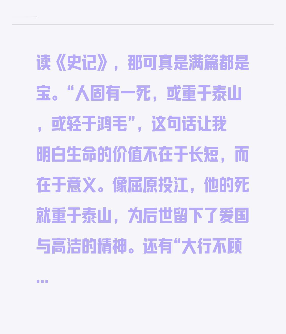 读《史记》,那可真是满篇都是宝。“人固有一死,或重于泰山,或轻于鸿毛”,这句话让我明白生命的价值不在于长短,而在于意义。像屈原投江,他的死就重于泰山,为后世留下了爱国与高洁的精神。还有“大行不顾细谨,大礼不辞小让”,告诉我们做大事不必拘泥小节。鸿门宴上,刘邦正是听了樊哙这话,才果断离席,逃过一劫。这些名句就像明灯,照亮我们在生活中做选择、明事理的路,让人受益匪浅。 史记 史记评论 国学经典史记 史记成语故事