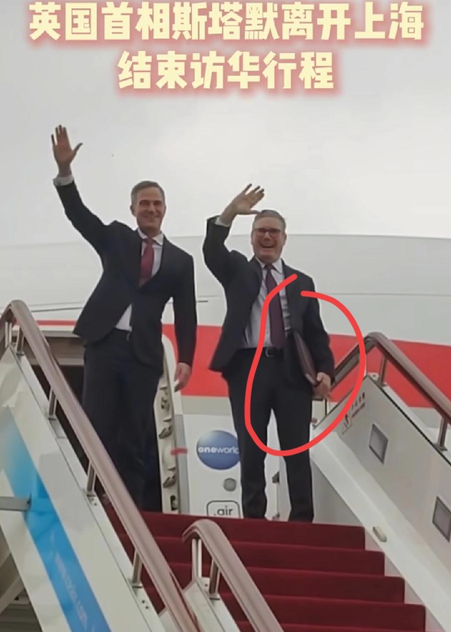 斯塔默离开上海,上飞机时,右手抱着一个大文件本子,在华期间的合影相册?上次李在明访华,中方就送了一本,看这种靠腰抱本子的习惯,典型英国风!中方3位人员送机,斯塔默来华访问4天,虽然天气寒冷,上海还下雨,阴雨连绵,但是斯塔默很习惯,像极了伦敦的天气,更重要的是,洽谈访问内容丰富,氛围非常好,下一站斯塔默将到访日本,关注后续!