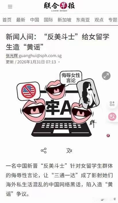 联合早报又搞事!炮轰牢A造黄谣,实则断章取义玩双标 1月31日一大早,新加坡联合早报又跳出来针对牢A发文,一句“反美斗士给女留学生造黄谣”,直接扣上大帽子,这吃相也太难看了! 谁都知道牢A向来同情美国底层人民,从未标榜过什么“反美斗士”,这顶帽子扣得莫名其妙。更何况他从始至终说的是部分不学好的留学生,男女都有,不过是撕开留学圈的部分乱象,提醒家长和学子警惕,句句有事实依据,何来造谣一说?真正的猫腻,是别有用心之人把“女留学生”单独剪切出来大做文章,把提醒歪曲成黄谣,联合早报不问青红皂白跟风攻击,这波操作实在让人看不懂。 要知道这可不是联合早报第一次玩双标了,此前曾以偏概全抹黑福建安溪,还不实报道郑永年事件,事后又仓促澄清,如今又对牢A断章取义,看似客观公正,实则选边站队带节奏。说到底,他们不是看不惯牢A,是看不惯有人敢撕开海外光鲜表象,戳破某些人不愿承认的真相,更是想借着舆论封杀不同的声音。 网络不是法外之地,舆论场更容不得断章取义的抹黑。牢A的提醒,戳中了不少家长的痛点,也让大家看清了留学圈的真实一面,这本身就有意义。而那些为了流量和目的,随意扣帽子、带节奏的媒体,终究会被网友看清真面目。公道自在人心,谁在说真话,谁在搞事情,大家心里都有一杆秤!