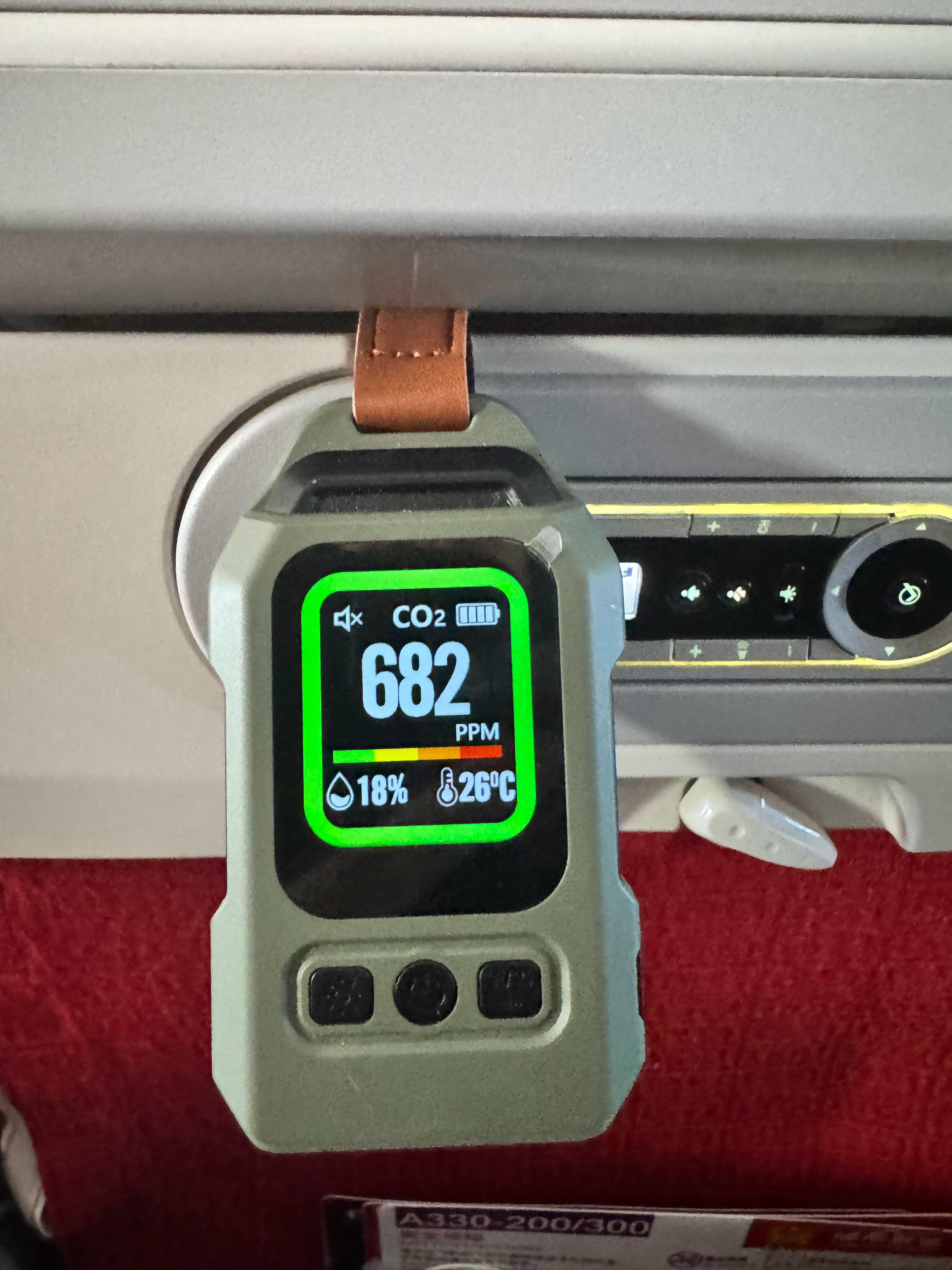 飞机大家放心坐,全程二氧化碳不超过1100ppm,基本在700~800左右待着。有机会上高铁测测