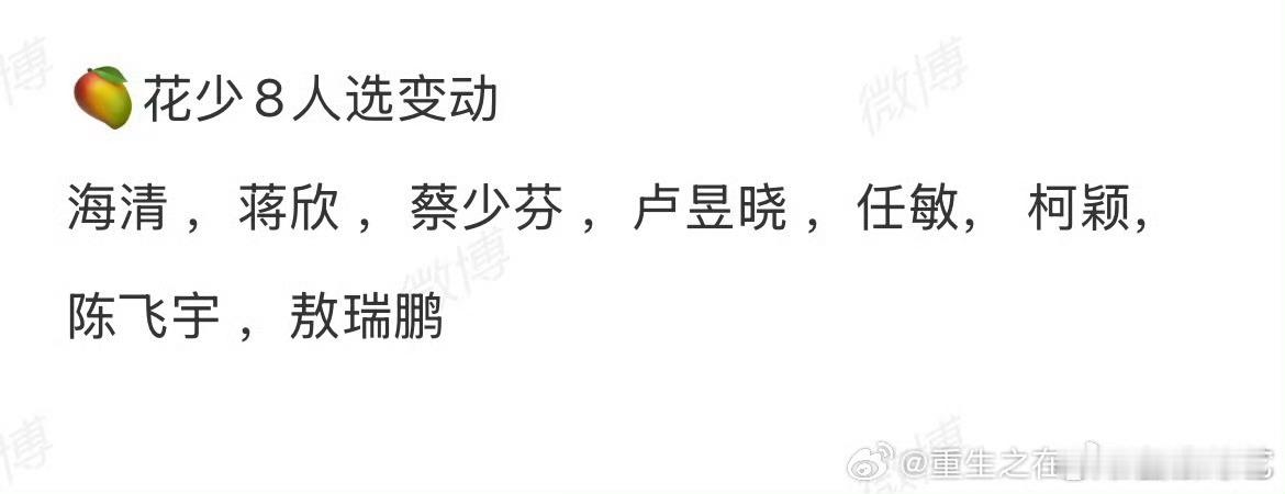 花少8网传最新阵容网传花儿与少年8最新阵容来了:海清 ,蒋欣 ,蔡少芬 ,卢昱晓 ,任敏, 柯颖, 陈飞宇 ,敖瑞鹏。新鲜血液+经典组合,你觉得这个阵容“化学反应”会如何?你最想看谁? 花儿与少年