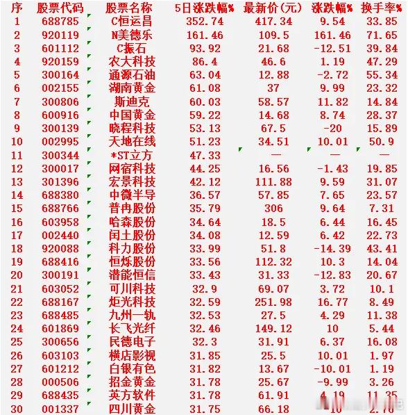 C恒运昌:5日涨幅 +352.74%,换手率 33.85%N美德乐:5日涨幅 +161.46%,换手率 71.65%C振石:5日涨幅 +93.92%,换手率 39.84%农大科技:5日涨幅 +86.40%,换手率 47.29%通源石油:5日涨幅 +63.04%,换手率 55.34%湖南黄金:5日涨幅 +61.08%,换手率 23.32%斯迪克:5日涨幅 +60.03%,换手率 14.84%中国黄金:5日涨幅 +59.22%,换手率 28.37%晓程科技:5日涨幅 +53.13%,换手率 15.89%天地在线:5日涨幅 +51.23%,换手率 50.90%