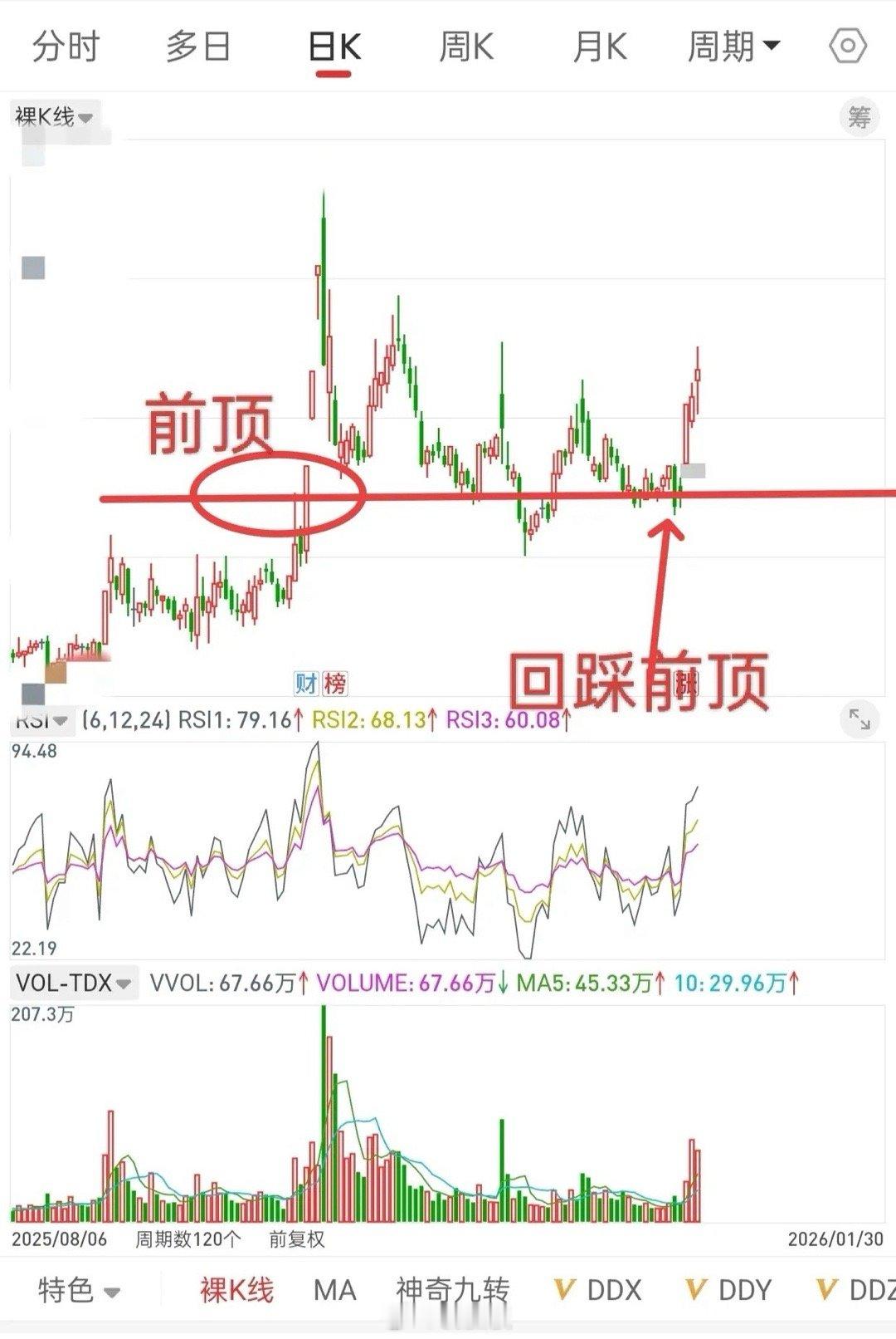 所以,前顶附近就是最佳上车点,同时前顶下方需带好小的防守,跌破前顶,小止损离场,没跌破等大肉。