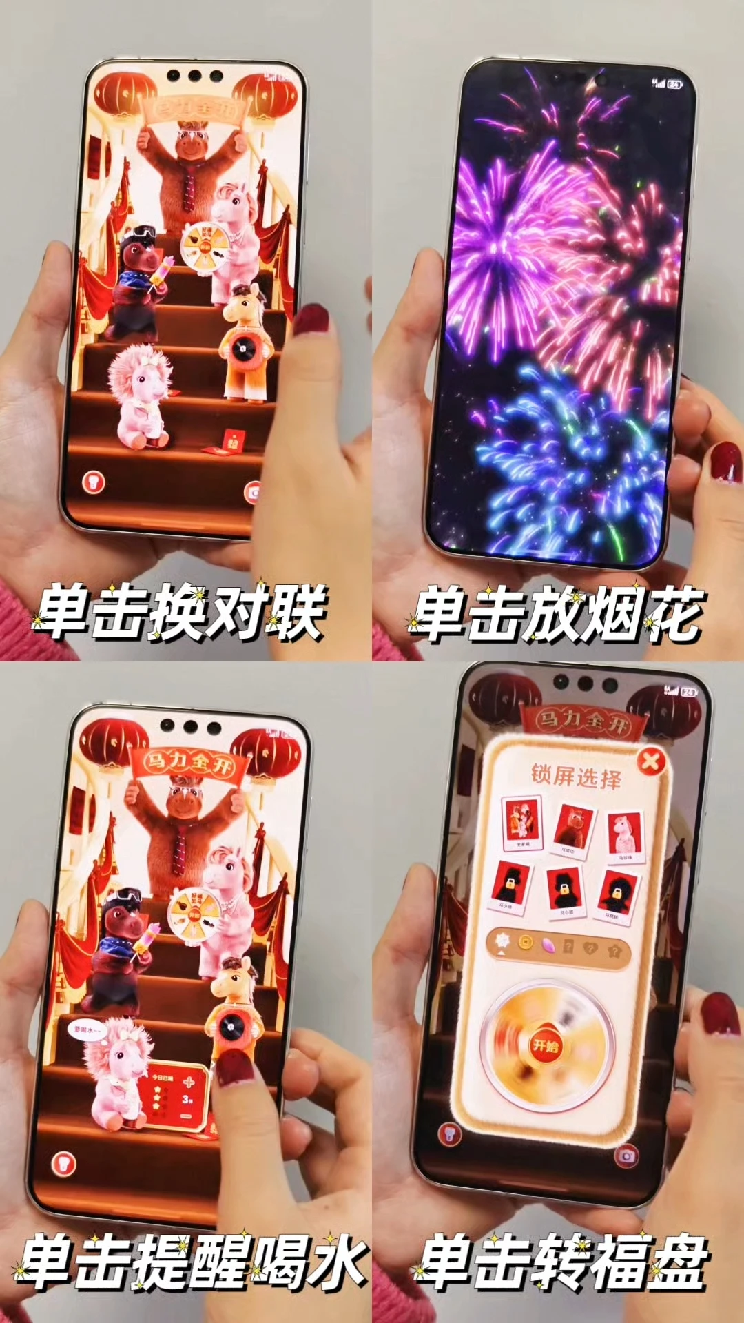 💙没想到这主题还能互动,每匹小马点一下都有惊喜:放烟花、转福盘、换对联…感觉我能玩一天哈哈哈~[偷笑R]