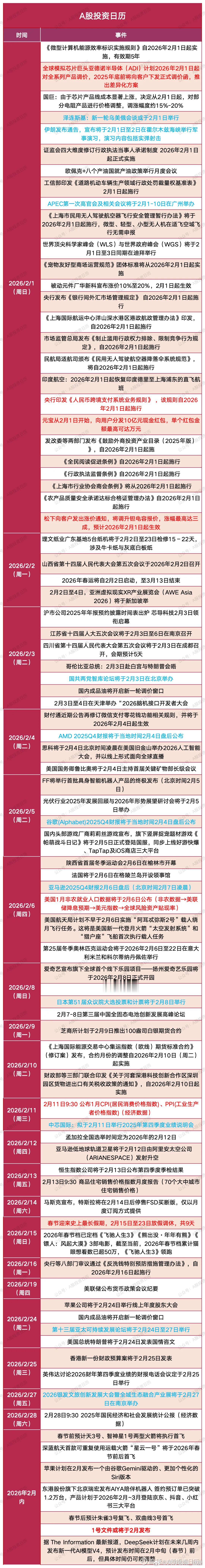 【下周资本市场大事提醒:美国将公布1月非农就业数据 芝商所宣布上调多个贵金属期货保证金比例】1、2月7日,中国将公布1月末外汇储备数据,此前中国央行已连续第14个月增持黄金。2、下周(2月2日-2月6日)央行公开市场将有17615亿元逆回购到期,其中下周一至下周五分别到期1505亿元、4020亿元、3775亿元、3540亿元、4775亿元。此外,下周三将有7000亿元91天期买断式逆回购到期。3、下周将有42股解禁,合计解禁数量为46.11亿股,以最新收盘价计算,总解禁市值为1034.19亿元。解禁市值居前三位的是:信达证券(448.79亿元)、中微半导(133.81亿元)、长江电力(121.51亿元)。4、下周将有1只新股发行。2月2日发行的是易思维。5、2月4日美国公布1月ADP就业人数,2月6日美国将公布1月非农就业数据。6、2月5日,欧洲央行和英国央行将相继公布利率决议,市场预计两者均将按兵不动。7、明星科技股谷歌、亚马逊、AMD业绩将陆续发布。8、日本将于2月8日举行众议院选举。9、芝商所CME再度大幅上调贵金属期货保证金。上期所调整白银期货涨跌停板幅度和交易保证金比例。10、“元宝”已于2月1日启动春节分10亿元现金活动,单个红包金额可达万元。百度文心自1月26日持续至3月12日,投放5亿元现金红包,同样设定了万元大奖上限。