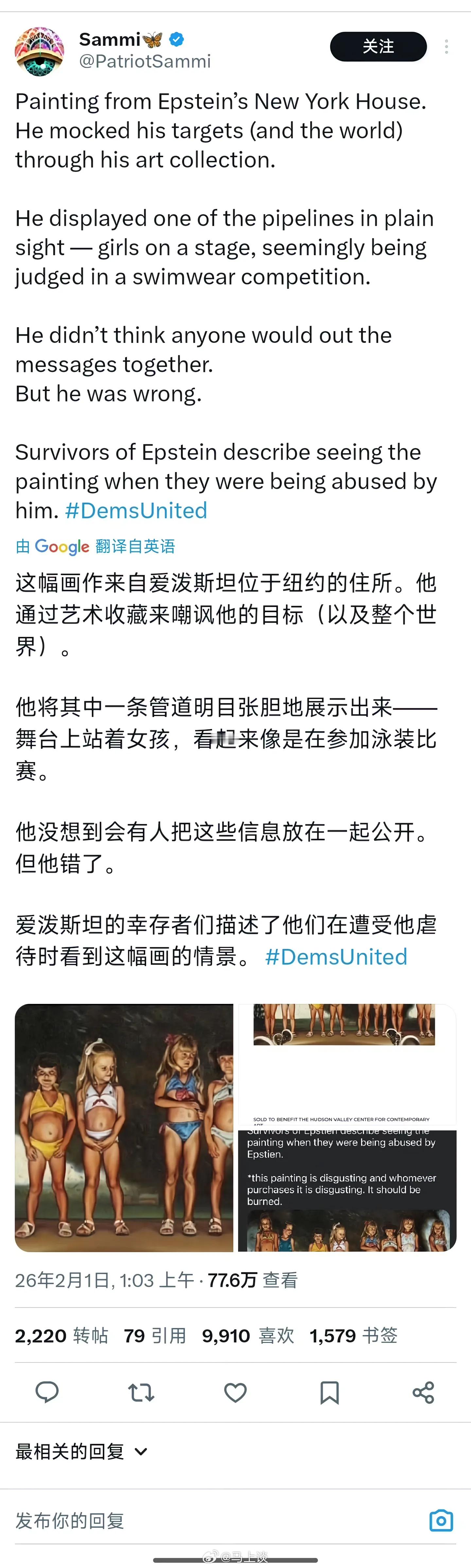 再给大家一点震撼:这幅画名字叫《粉色小番茄小姐》,是爱泼斯坦的藏品,目前处于拍卖状态见图三,起拍价2-3万刀。西方这些上萝莉岛的权贵们是多么的恶臭可想而知。