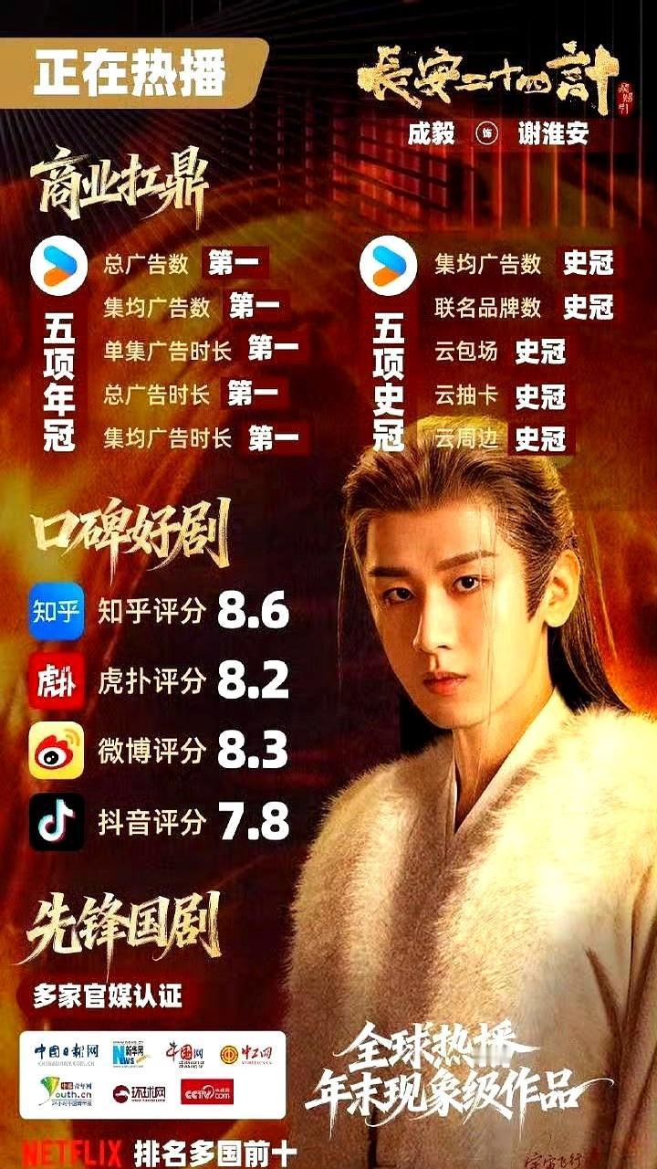 成毅杀疯了,广告商追着他连投了三部剧。 换做你是老板,敢追着一个演员连投三部剧吗?《长安二十四计》的广告多到溢出,后面来的商家只能排队加钱追投。 2025年,他先是《赴山海》里穿越的咸鱼肖明明,被打磨成大侠萧秋水。转身又进了《天地剑心》,从一个没感情的道门兵人,硬生生撕开枷锁,成了王权富贵。 年底,他又成了《长安二十四计》里蛰伏十年、只为复仇的谢淮安。你以为这就完了?三年前的李莲花,2026年开年热度直接杀回一个亿。 现在,他正在拍张黎的《两京十五日》,演太子朱瞻基。剧还没杀青,粉丝的应援大屏已经把横店的轻轨都包了。 别人都在赌下一个爆款,而成毅,他自己就是确定性。