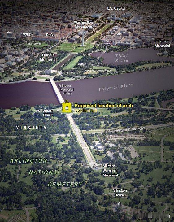 特朗普要建美国凯旋门,高250英尺约76.2米,比白宫和林肯纪念堂都高。 白宫21米,林肯纪念堂也不过30米,特朗普要的是功高盖世的标志。 其实美国已有世界最高的人工大门建筑,是位于密西西比河和其支流汇合处的圣路易斯钢铁大拱门,高192米。 现在起名叫凯旋门,等建好了就该叫特朗普门了,否则就失去建造者的本意了。 为了精准配合美国建国250周年,也有可能命名为特朗普250凯旋门……