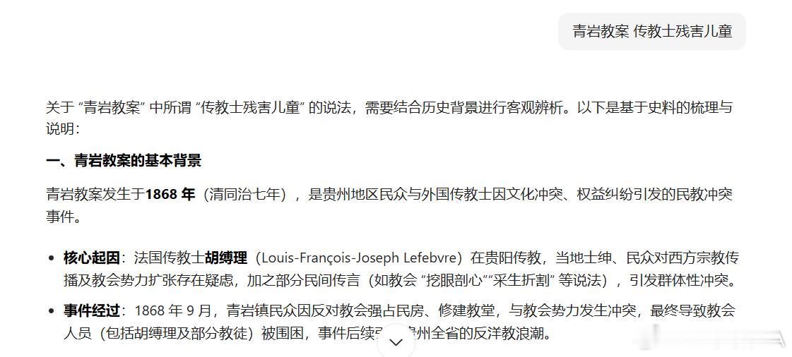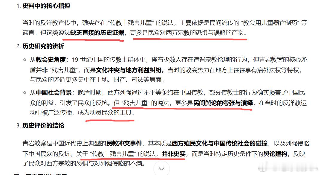 合着还是民众愚昧。当年大清从官府到民众,也不买点高清4K摄录器材,录音笔啥的,从“天津教案”到“丹阳教案”等,即使有着西方传教士,教堂残害儿童清晰的历史事实记载,也不妨碍豆包轻松断定“证据不足”“不是史实”。