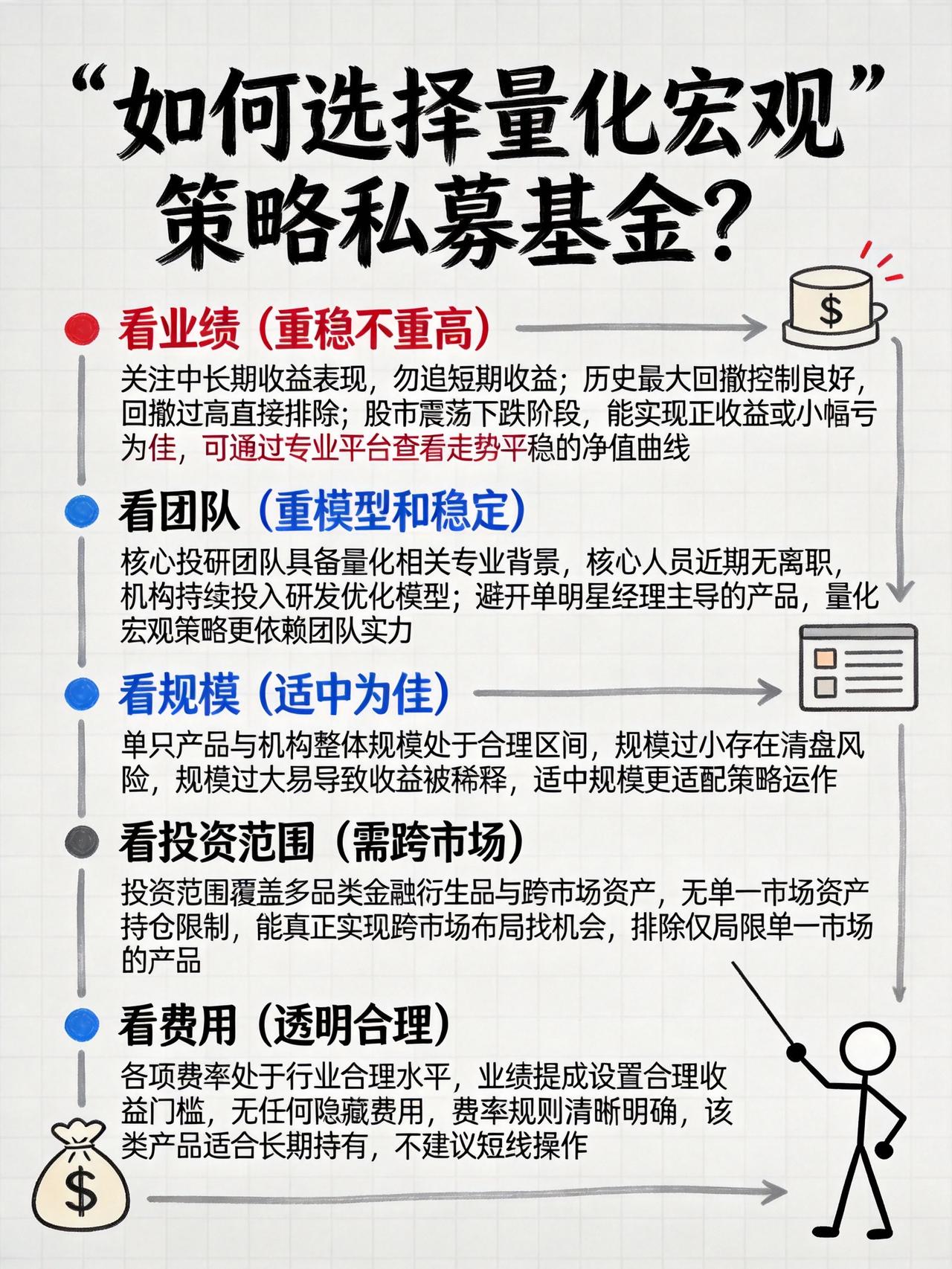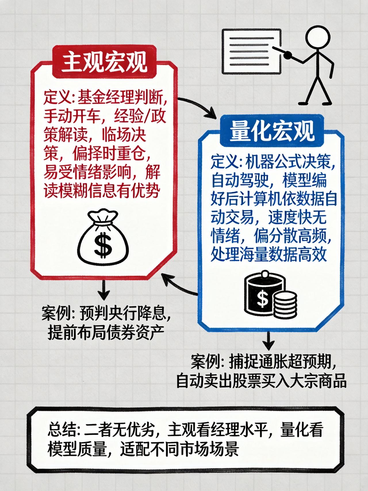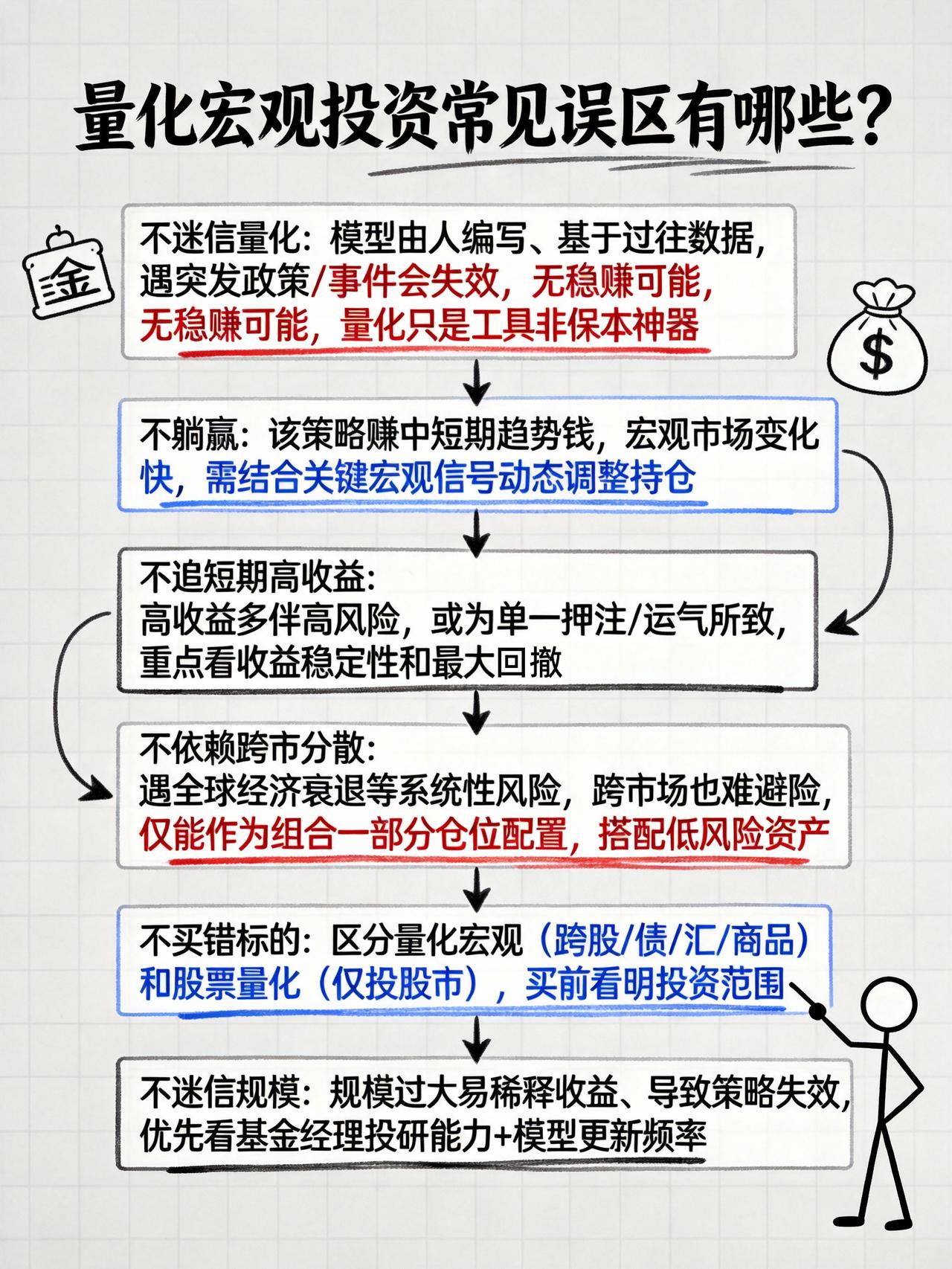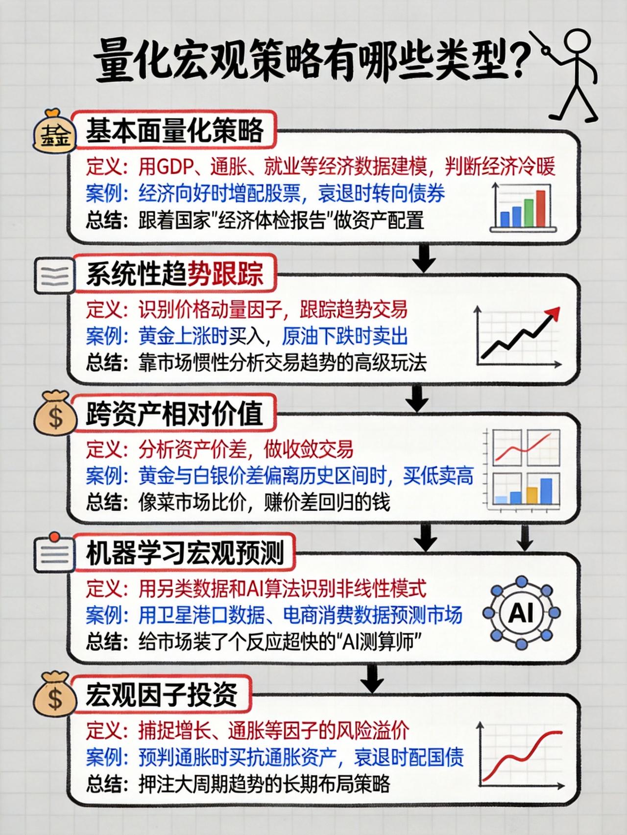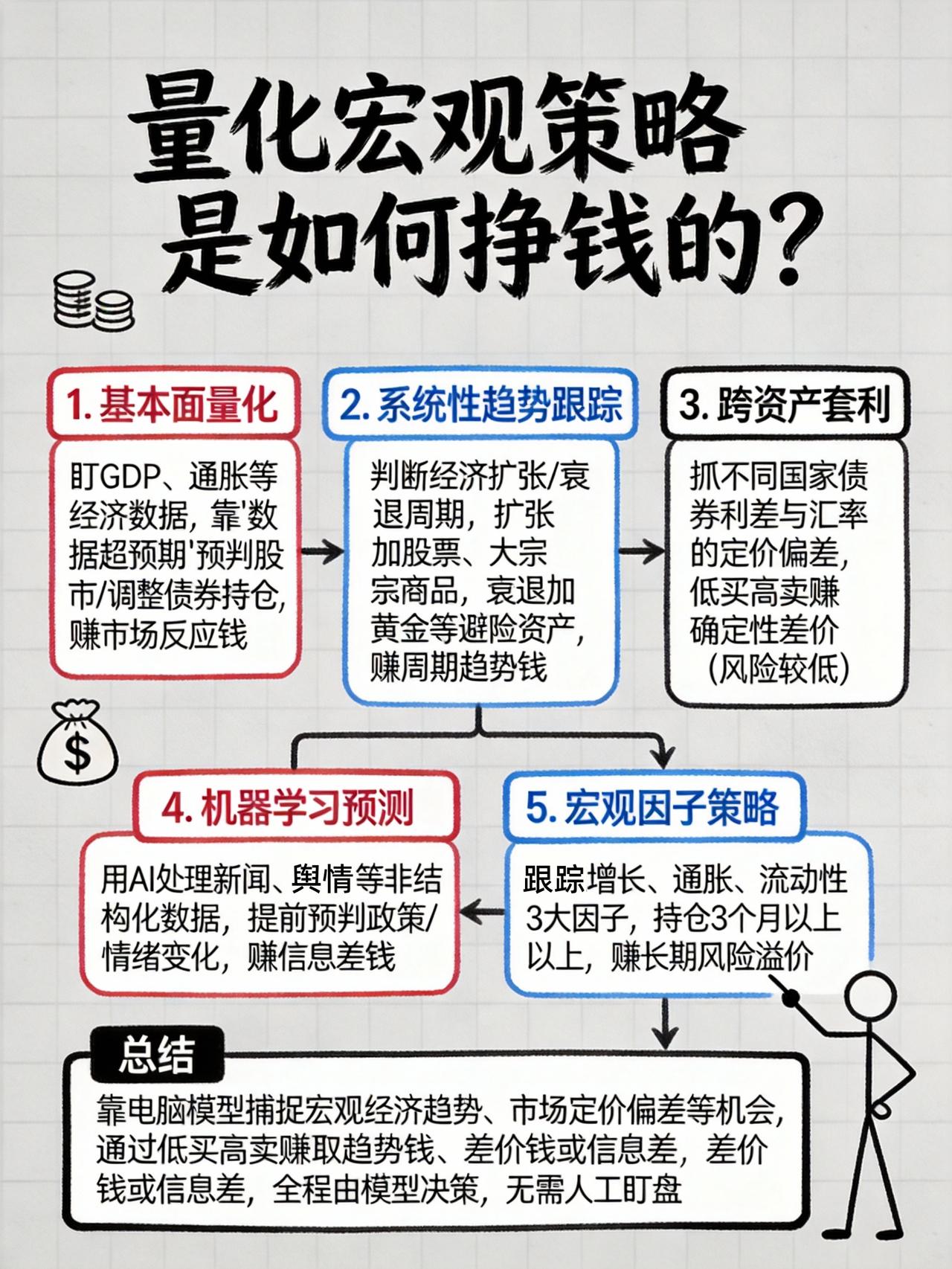 一文看懂最近爆火的量化宏观策略! 最近被“量化宏观”刷屏了?别慌!6张图带你从入门到避坑,搞懂这个华尔街大佬都在用的投资策略👇 ✨什么是量化宏观? 简单说就是:用电脑模型分析全球大市场趋势(比如央行加息、汇率涨跌),自动低买高卖,哪里有机会就切换到哪个市场。 不用人盯盘,还能避免情绪化犯错,堪称投资界的“自动驾驶”🚗💨 📊常见策略类型 基本面量化:跟着GDP、通胀等经济数据做资产配置 系统性趋势跟踪:追着黄金、原油的价格趋势交易 跨资产套利:像菜市场比价一样赚资产价差回归的钱 机器学习预测:用AI和另类数据(比如卫星港口数据)预判市场 宏观因子投资:押注通胀、增长等大周期趋势做长期布局 🤔量化宏观vs主观宏观 主观宏观:基金经理手动决策,靠经验和政策解读,适合模糊信息判断 量化宏观:机器公式自动交易,速度快、无情绪,擅长处理海量数据 👉没有绝对优劣,关键看经理水平和模型质量 💸它是怎么赚钱的? 核心就是靠模型捕捉宏观趋势、定价偏差: 赚经济数据超预期的“反应钱” 赚周期趋势的“趋势钱” 赚跨资产价差的“套利钱” 赚AI预判的“信息差钱” 🎯选量化宏观私募避坑指南 ✅看业绩:重稳不重高,关注最大回撤和长期收益 ✅看团队:核心投研要专业,依赖团队而非单明星经理 ✅看规模:适中最好,太小有清盘风险,太大收益稀释 ✅看范围:必须跨市场,排除单一市场产品 ✅看费用:费率透明合理,适合长期持有 ⚠️常见误区别踩! ❌不迷信量化:模型不是稳赚神器,遇突发事件会失效 ❌不躺赢:需要动态调整持仓,不能买了就不管 ❌不追短期高收益:高收益伴随高风险,稳定性更重要 ❌不依赖跨市分散:系统性风险下跨市场也难避险,要做组合配置 ❌不买错标的:区分量化宏观(跨股/债/汇/商品)和股票量化(仅股市) ❌不迷信规模:规模太大易稀释收益,优先看投研能力和模型更新频率