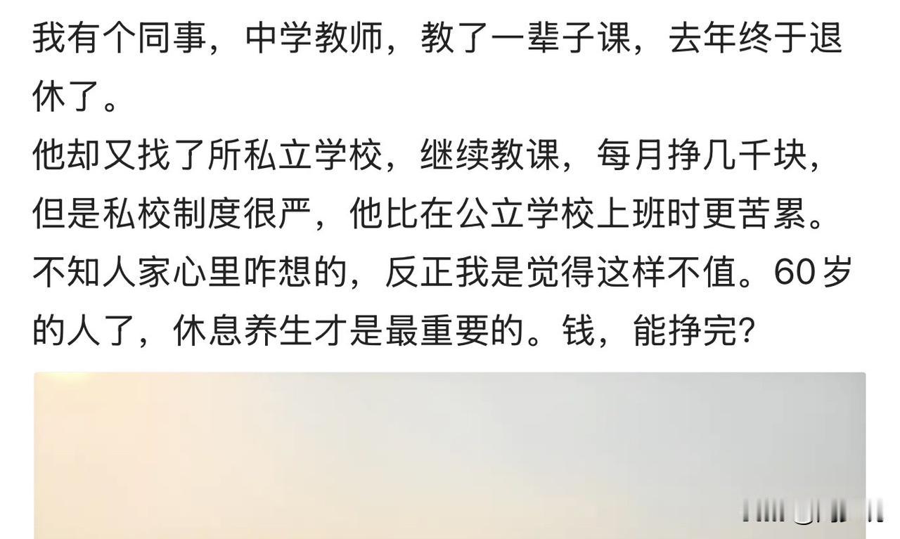 “真让人不解!”一位网友爆料身边同事教师的真事,引发热议。教了一辈子书的中学老师,好不容易熬到退休,转头就扎进私立学校继续教课。每月就挣几千块,还得遵守比公立校严苛得多的制度,比在岗时还要苦累。这事,让身边人满是费解。 网友们也议论纷纷,有人直言:“60岁的年纪,在家养花遛鸟享清福不好吗,何必遭这份罪”。 也有人表示理解:“干了一辈子的事业,哪能说放下就放下,讲台早成了生活的一部分”。 针对此情况,周少认为无非两种情况,一方面是特别热爱这个岗位,想继续发挥余热。另一方面可能是想多赚钱。大家觉得呢?#寻美三湘# #长沙新朋友#