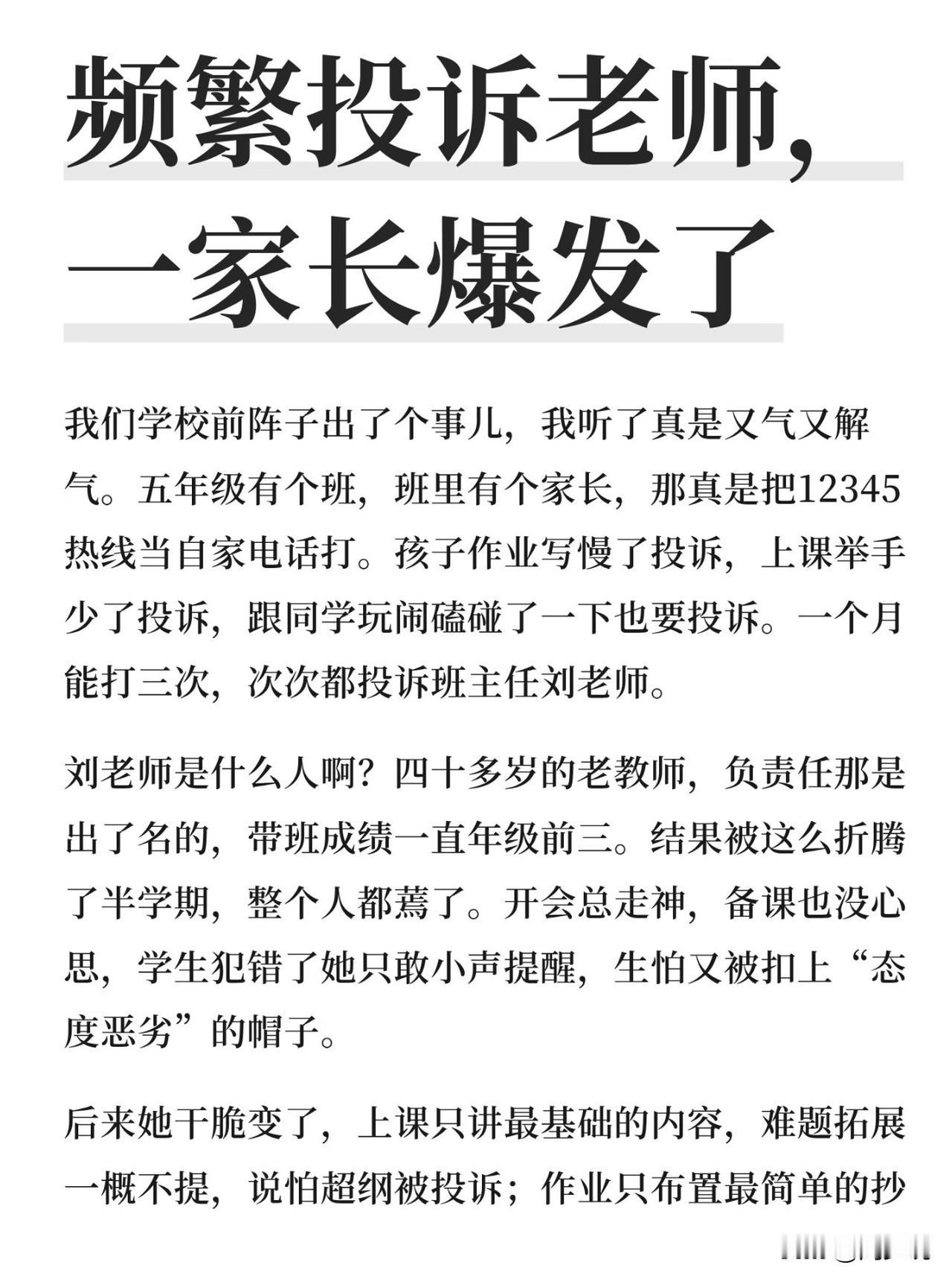 “这家长真是把12345当自家热线啊!”看到一位老教师的遭遇,真叫人又气又无奈。这位四十多岁的老教师,带班成绩常年稳居年级前三,妥妥的负责任好老师。可班里有位家长,愣是把12345投诉热线当成了自家电话,孩子作业写慢了要投诉,上课举手少了要投诉,跟同学玩闹磕碰到也得投诉,一个月足足投诉三次。后来这位教师上课只讲最基础的内容,难题拓展一概不提,说怕超纲被投诉。 这番折腾下来,网友们都看不下去了。有网友说:“这样的家长,简直是在毁老师的责任心”! 还有网友表示:“老师管得多错得多,最后谁还敢好好教书?”。 看完这事,周少想说这位家长半学期的轮番投诉,让原本干劲十足的老教师彻底蔫了。开会走神,备课没心思,学生犯错只敢小声提醒,生怕被扣上“态度恶劣”的帽子。 到最后,她干脆彻底“躺平”。上课只讲最基础的内容,难题拓展一概不提,怕被说超纲;作业只布置最简单的抄写,不敢有半点额外要求。 毫不夸张的说,这位家长的过度投诉,不仅磨掉了一位好老师的教学热情,更耽误了一整个班孩子的学习。 实际上,家校之间本应是互相配合的伙伴,毫无底线的投诉,只会寒了老师的心,最终受伤害的,还是课堂上的孩子们。教育不是老师一个人的战场,多些理解和包容,才是对孩子最好的守护。#寻美三湘# #长沙新朋友#