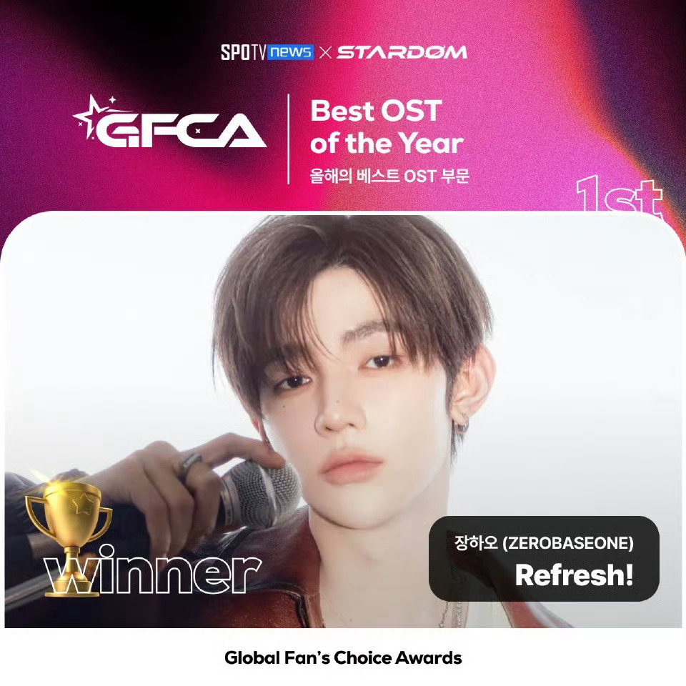 章昊收获个人第九座奖杯🏆凭借韩剧OST《Refresh!》斩获GFCA全球粉丝选择奖——年度最佳OST!