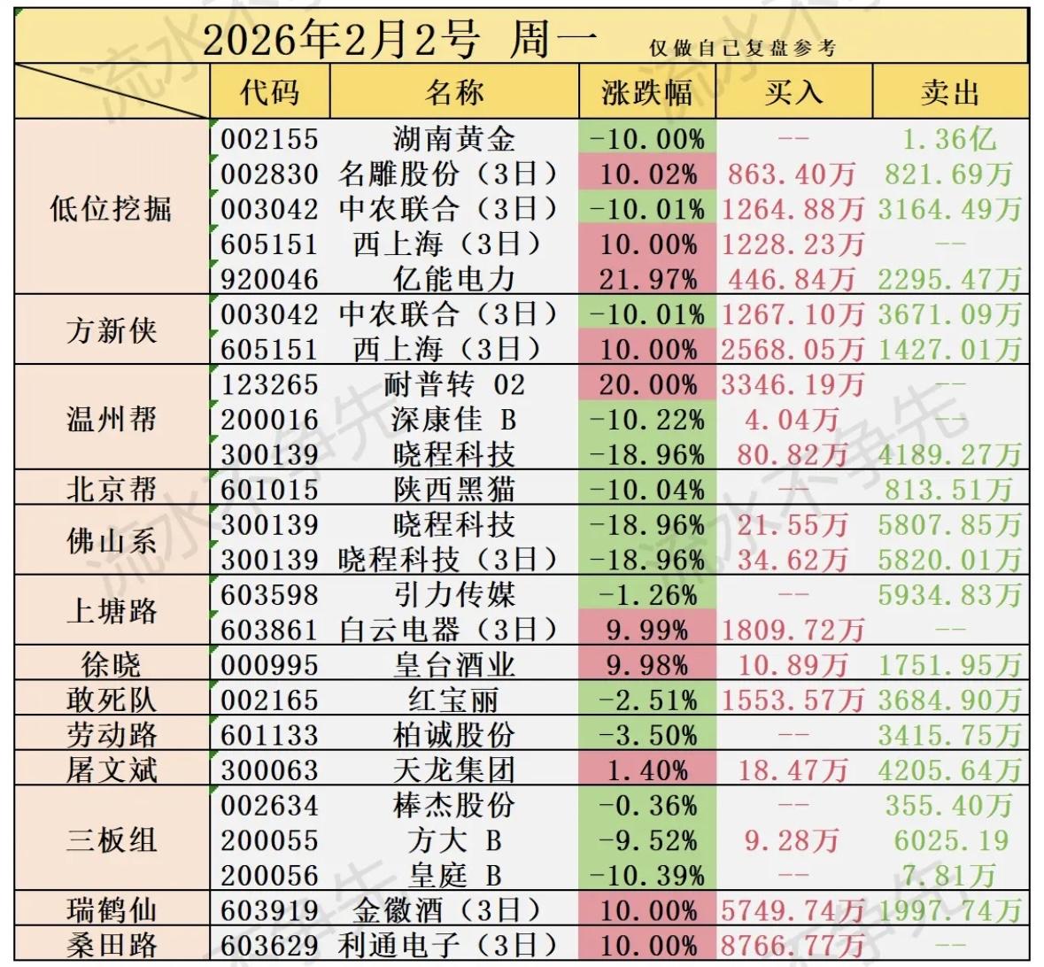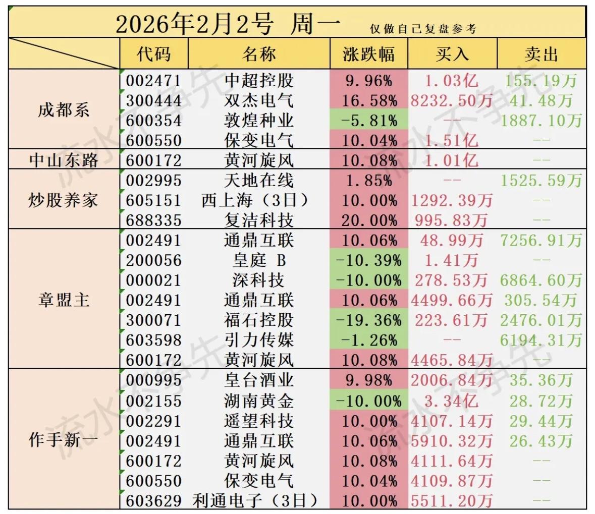 2026年2月2日龙虎榜股票涨跌幅分析,投资参考! 股市复盘:多股涨停,中超控股领涨,福石控股大跌,游资活跃,板块分化明显。