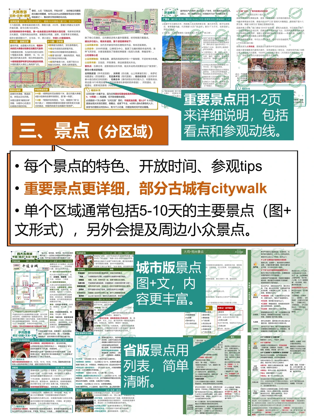 ▪️城市/区域也是8份,吃住行与城市版一致,景点介绍用列表,较为简单。