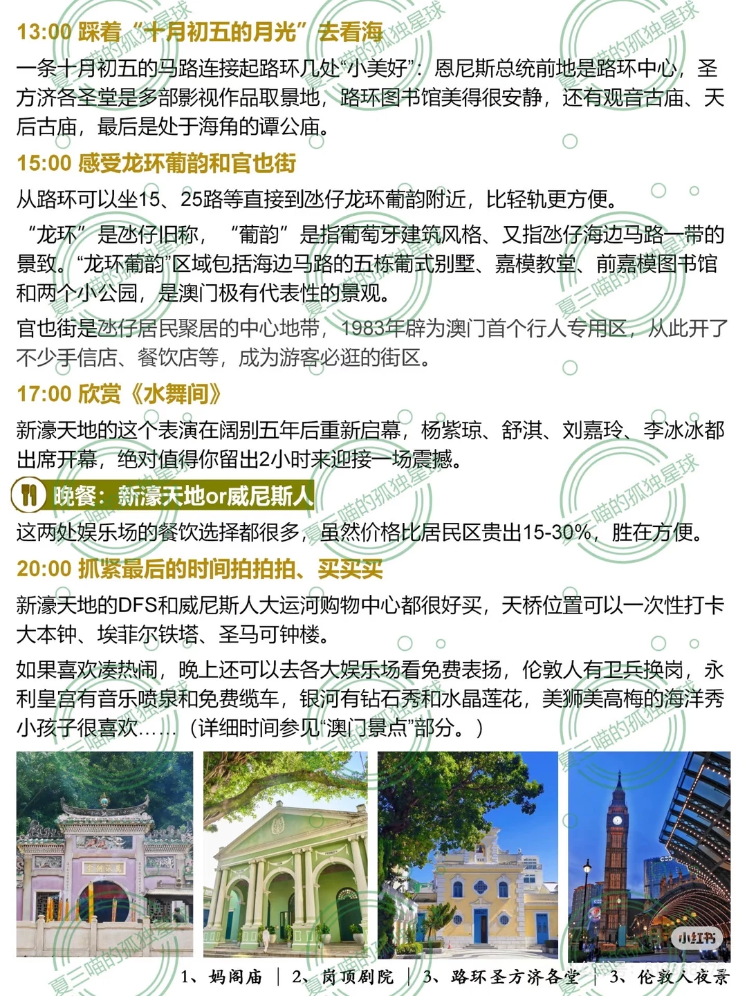 3️⃣澳门老城区核心是大三巴、议事亭前地、岗顶前地到妈阁前地,半天能走完;想拍照出片去疯堂斜巷+东望洋炮台;喜欢历史去白鸽巢、加思栏一带。