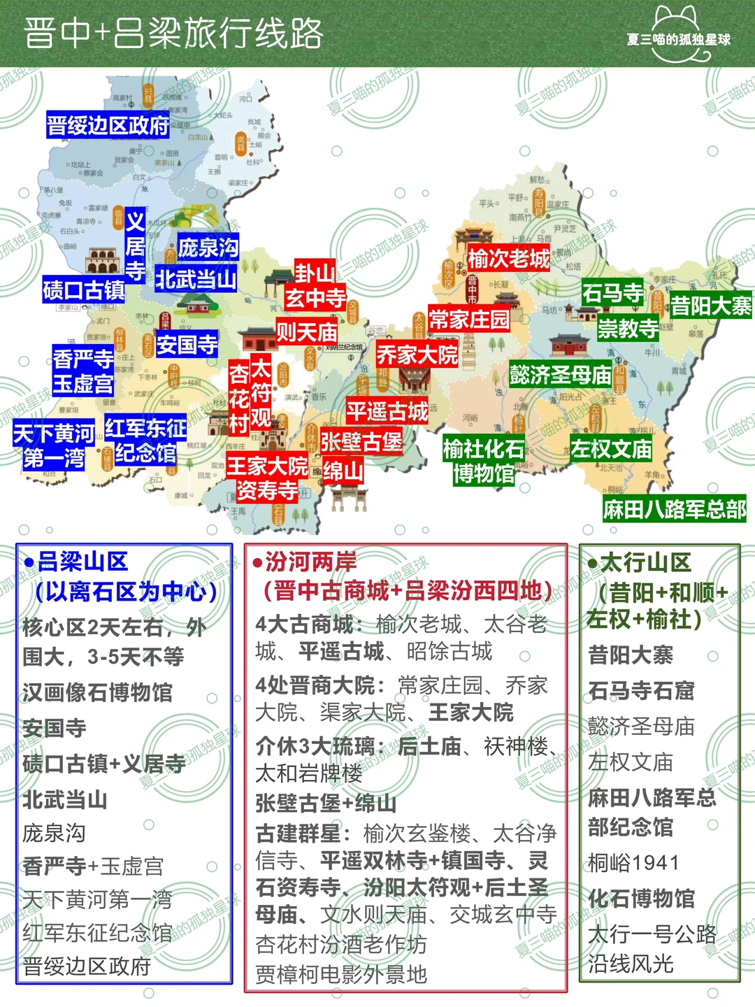 可以住汾阳(古汾州治所,贾樟柯“痛城”),以此为中心游览,自驾2-3天,公共交通3-5天能看得比较过瘾。