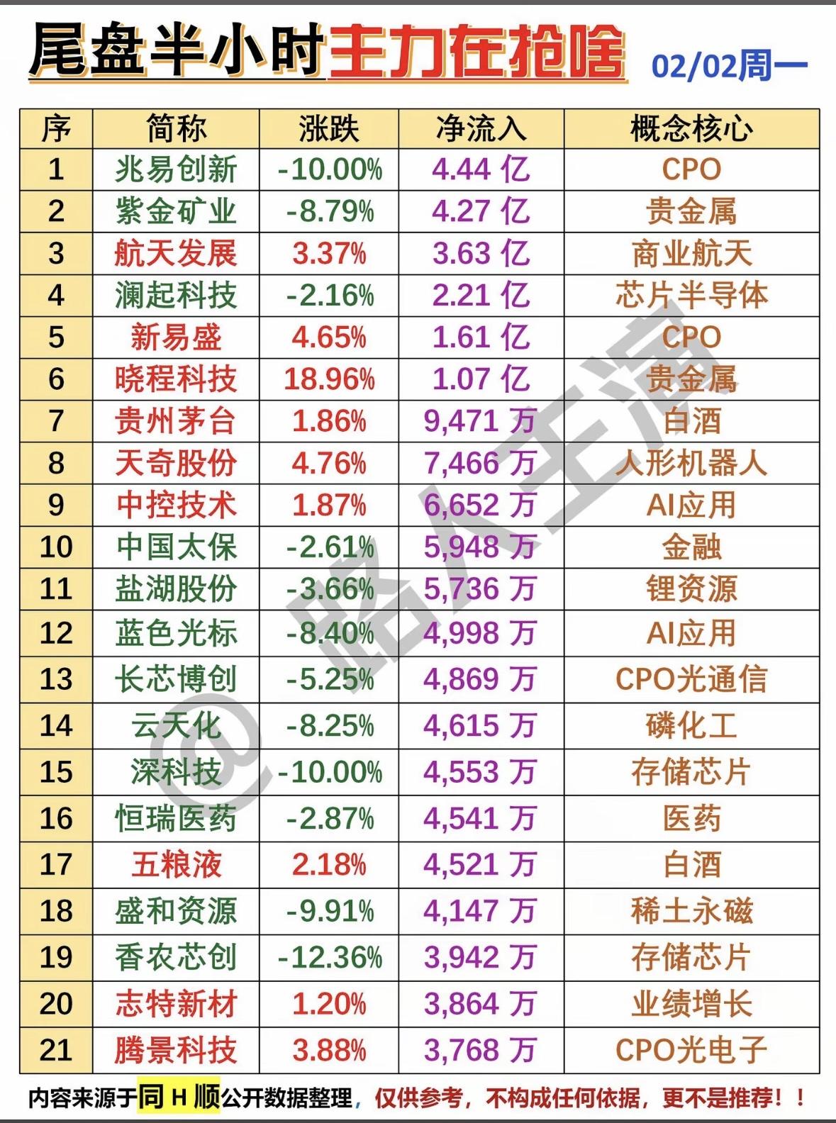 “2月2日尾盘半小时主力抢筹,揭秘哪些股票被重点关注!”📈💰🔍 主力抢筹CPO、贵金属、商业航天,兆易创新、紫金矿业、航天发展领涨;白酒、人形机器人、AI应用跟风活跃。