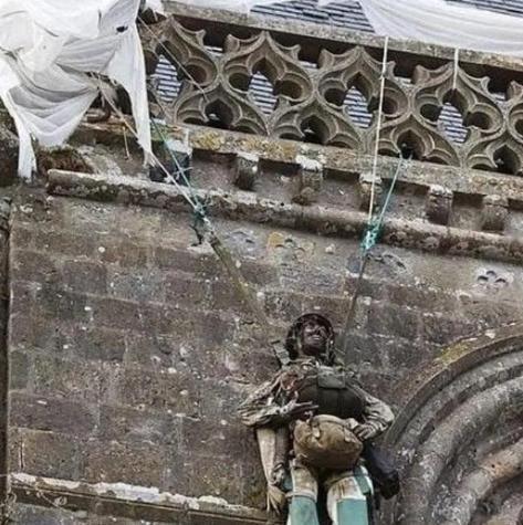 1944年,一名伞兵因失误,被挂在法国的一个教堂上,当德军发现他的时候,他装死骗过了德军,然而,令他没想到的是这次装死,竟然让他在教堂上“挂”了75年。 主角约翰·斯蒂尔,是美国第82空降师的一名伞兵,行动定在6月5日深夜,约翰和战友们乘飞机出发,目标是法国圣梅尔埃格利斯镇,这个小镇是盟军要夺取的关键节点,当时驻扎着德军。 跳伞指令下达后,约翰跟着战友跳出机舱,可天不遂人愿,一阵风把他吹偏了方向,直接落到了小镇中心的教堂上空,降落伞被教堂尖顶的栏杆死死挂住,他整个人悬在半空中,动不了分毫。 地面上的德军已经发现了空降的盟军,正在猛烈射击,很多战友还没落地就牺牲了,约翰悬在半空,成了现成的活靶子,他想掏出伞兵刀割断伞绳,可手一滑,刀掉在了地上,正好落在一名德军面前,德军抬头发现了他,立刻举枪射击。 幸运的是,子弹只打中了他的脚,剧痛传来,约翰脑子飞速转起来,硬扛肯定死,只能赌一把,他立刻停止挣扎,全身绷紧,一动不动,假装已经被打死。 德军见他没了动静,又忙着清缴其他伞兵,就没再管他,约翰就这么悬在教堂上,听着下面的枪声、爆炸声,还有教堂钟声的轰鸣,硬生生扛了两个小时。 直到傍晚,德军清理战场时,才想起教堂上还挂着个“美军尸体”,他们把约翰放下来,发现他还活着,就把他关了起来。 可约翰没放弃,当天晚上就找到机会逃了出去,归队后又跟着战友重新攻占了这个小镇,战斗中,他还击伤30名德军,打死11人,立了战功。 战争结束后,约翰的事迹在小镇传开,当地人感念他的勇敢,也纪念这场解放之战,就做了一个和他当时跳伞姿态一样的伞兵雕像,挂在了当年他被卡住的教堂尖顶上。 这一挂,就没取下来过,从战后直到2020年左右,整整75年,小镇还把他的事迹画在了教堂的彩绘玻璃上,约翰也被授予了圣梅尔埃格利斯镇的荣誉市民,余生里经常回到这里探望。 后来有人问他当时怕不怕,他说最怕的不是受伤,是悬在上面的时候,不知道自己能不能活过那天,谁也没想到,当年为了保命的装死,竟让他以这样的方式永远留在了这个小镇。 现在那个雕像还挂在教堂上,成了当地的标志性景点,来往的游客看到它,都会想起70多年前那个深夜,悬在半空的伞兵,和那场改变战争走向的登陆行动。 以上部分内容是小编个人看法,如果您也认同,麻烦点赞支持!有更好的见解也欢迎在评论区留言,方便大家一同探讨。