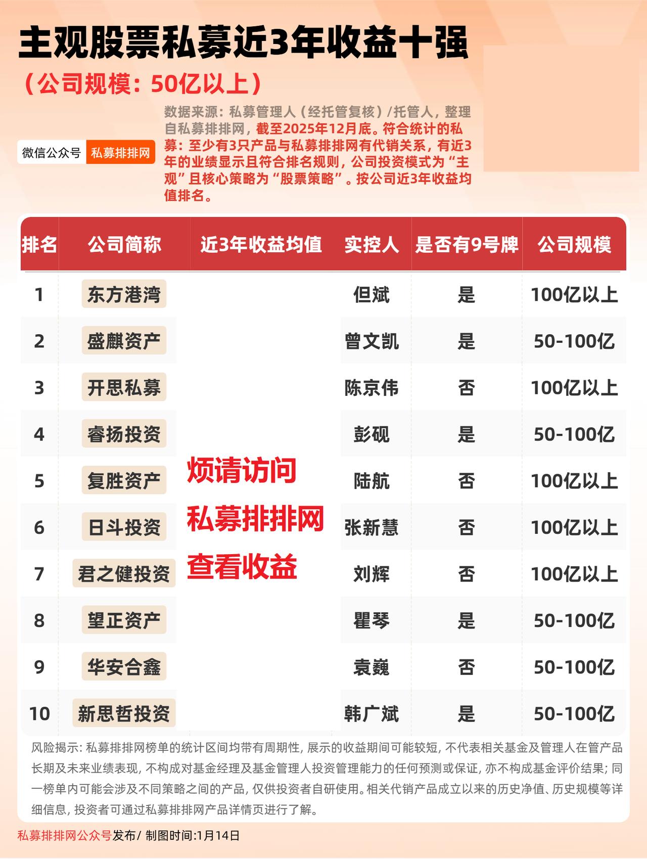 主观股票私募近三年业绩排名一览 点击查看私募最新业绩: 截至2025年12月末,根据私募排排网统计,在满足近三年业绩披露产品不少于3只、公司核心策略为股票策略、管理规模超过50亿元的头部主观股票私募中,共有23家机构符合条件。 50亿以上规模的主观私募基金公司中,近三年业绩排名前十的私募基金公司为东方港湾、盛麒资产、开思私募、睿扬投资、复胜资产、日斗投资、君之健投资、望正资产、华安合鑫、新思哲投资等公司。 1、东方港湾 公司实控人为但斌,公司规模在100亿以上,且持有9号牌。在但斌看来,独立思考的精神和长期主义的信念在投资实践中尤为重要。过去几十年里,中国经历了电子工业时代、互联网时代、移动互联网时代,每一次浪潮都孕育了巨大的财富机会,但真正能够把握住机会、赚到大钱的人却寥寥无几。 2、盛麒资产 公司实控人为曾文凯,公司规模在50-100亿之间,且持有9号牌。盛麒资产成立于2018年,专注于价值与成长,信奉大道至简。 3、开思私募 公司实控人为陈京伟,公司规模在100亿以上。陈京伟主导公司投研体系搭建,聚焦基本面深度研究,在消费、高端制造等领域布局核心标的。 4、睿扬投资 公司实控人为彭砚,公司规模在50-100亿之间,且持有9号牌。彭砚是公司投研核心负责人,擅长行业轮动与个股精选策略,注重企业基本面的验证与跟踪。 5、复胜资产 公司实控人为陆航,公司规模在100亿以上。陆航是复胜资产创始人、首席投资官,以成长股投资为核心,依托深度产业研究驱动选股,聚焦具备长期增长逻辑的优质企业。 6、日斗投资 公司实控人为张新慧,公司规模在100亿以上。张新慧主导公司投研策略,聚焦景气行业的优质标的,注重收益与风险的平衡。 7、君之健投资 公司实控人为刘辉,公司规模在100亿以上。刘辉是公司核心管理人,擅长挖掘低估值高成长标的,注重组合的安全边际。 8、望正资产 公司实控人为瞿琴,公司规模在50-100亿之间,且持有9号牌。瞿琴带领团队深耕产业链研究,在高端制造、大消费等领域布局核心资产,以基本面为核心结合行业趋势调整组合。