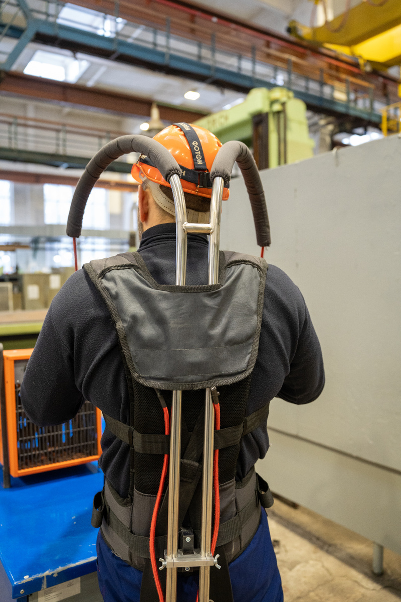 第二款是"基础"型号,本质上是一个用于支撑脊柱的辅助护具。我们在机械装配车间进行测试,那里的机床操作员需要长时间站立工作。虽然此处的体力负荷相对较小,但持续的静态姿势会给背部带来巨大压力。该外骨骼有助于保持正确姿势,减轻疲劳,使人能更长时间保持高度集中的注意力——这是保证车削和铣削加工质量的关键因素。