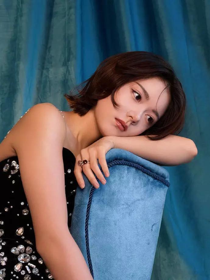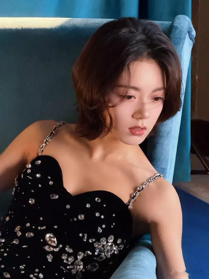 青青娱乐赵今麦穿黑色吊带裙点缀钻石 一头短发五官精致迷人
