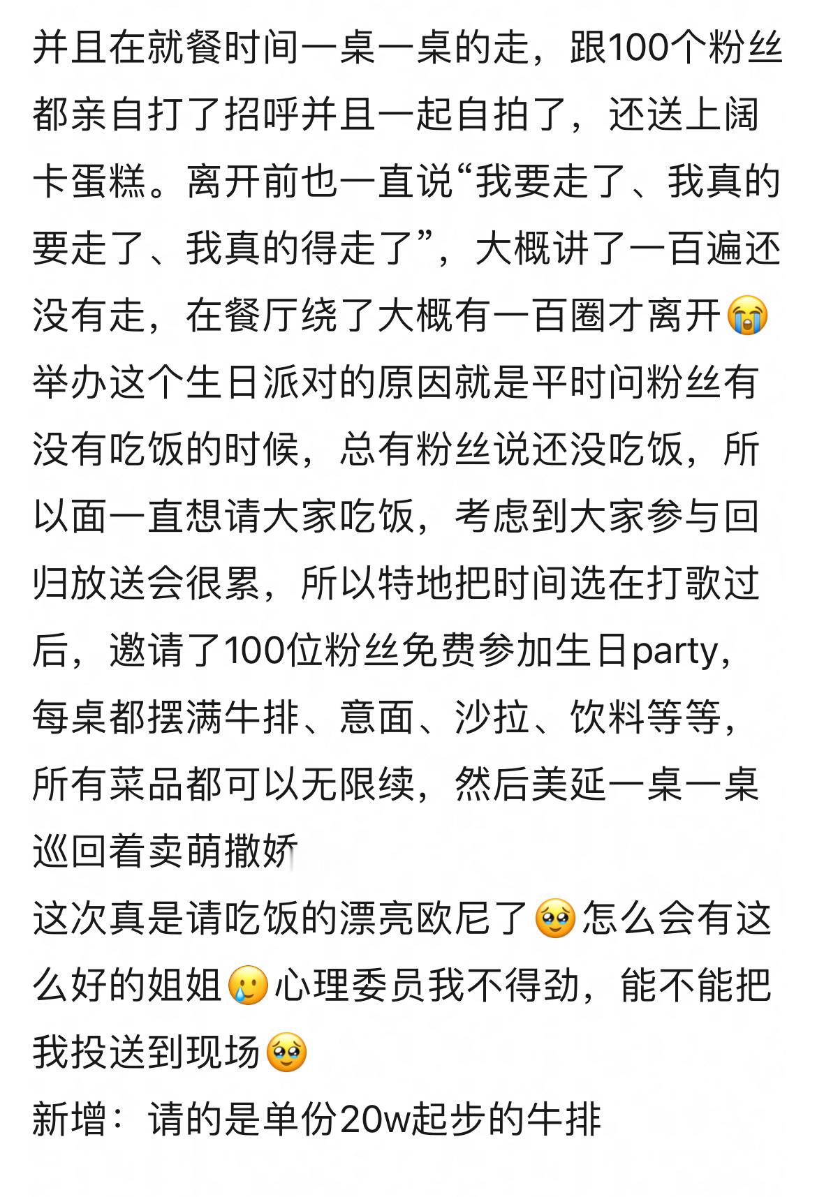 赵美延生日自费请了100名粉丝吃单份20w起步的牛排自助餐,逆应援还送了自己出圈