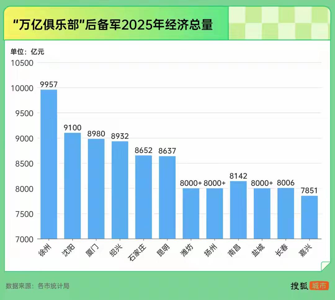 财经 老徐官宣并非万亿之城,实际GDP为9957亿,距万亿仅差43亿。它正式宣告与温州、大连分道扬镳。至此,中国大陆GDP万亿俱乐部的29个成员名单也尘埃落定。 2026年,有两座城市GDP超9000亿,其一为徐州,另一是沈阳。徐州即便按部就班发展,躺平也能迈入万亿之城行列。反观沈阳,想要达成目标似乎较为吃力。若发展顺利,徐州与沈阳有望双星闪耀;若状况不佳,那老徐定会一骑绝尘。 江苏 温州 大连 沈阳