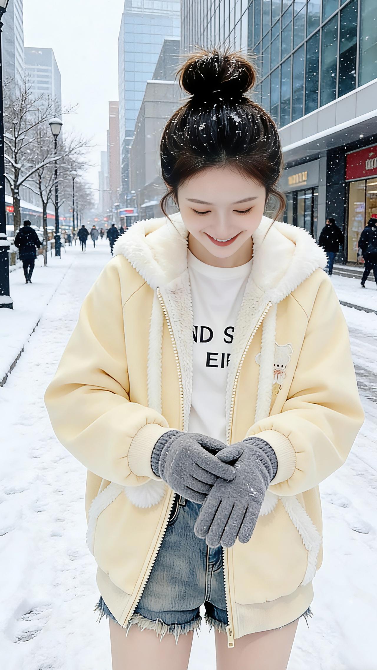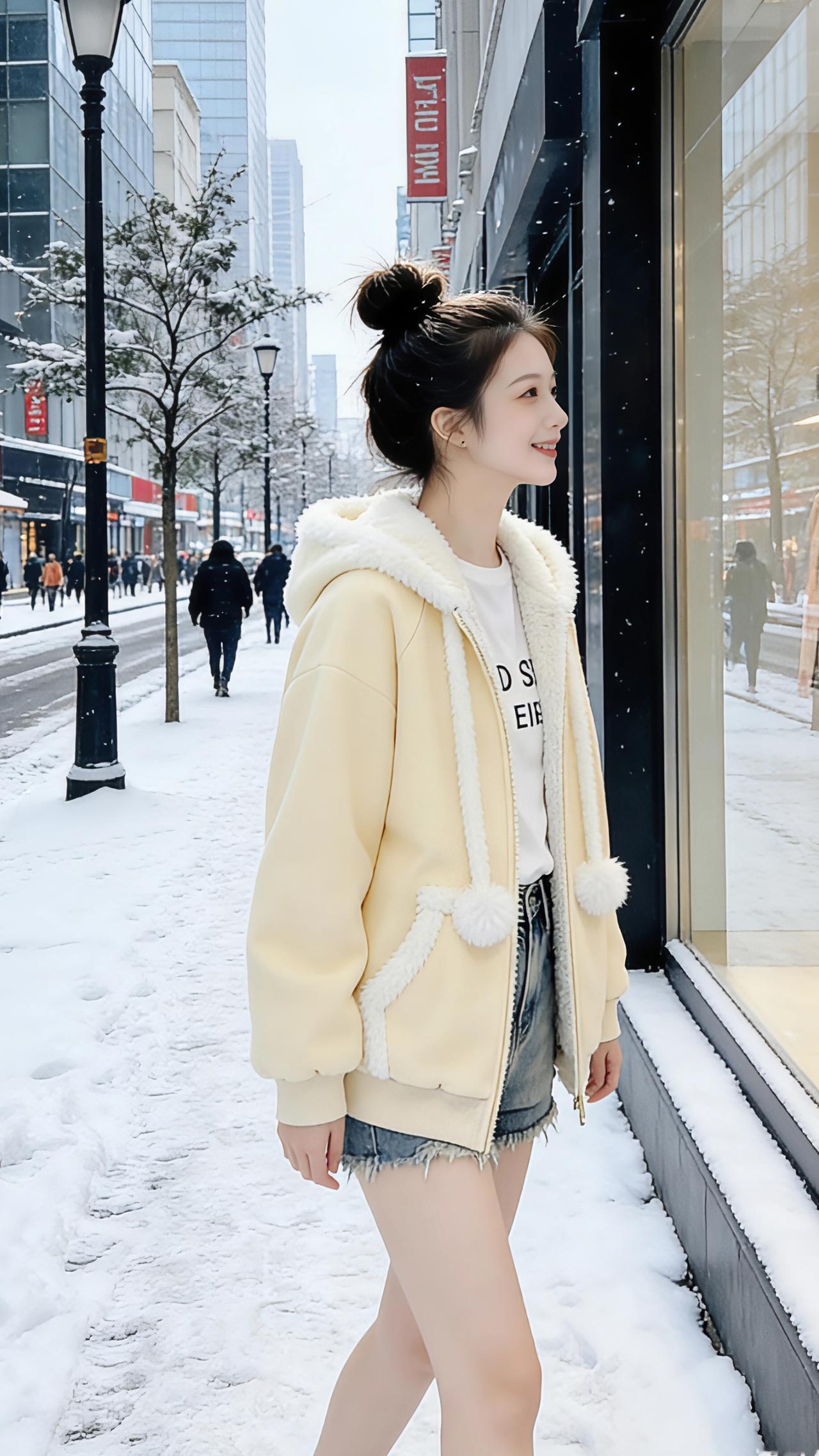 暖黄冬雪 雪落满了都市的柏油路,像给冰冷的街面盖上了一层蓬松的糖霜。 她穿着那件暖黄色的外套走在雪地里,像从冬雾里捧出的一颗小太阳。毛领的白边沾了细碎的雪粒,随着步伐轻轻晃动,与街角落满雪的梧桐枝桠相映成趣。 路过橱窗时,她偏头望进去,玻璃映出她蓬松的丸子头,笑意里裹着一点孩子气。手套上沾的雪还没化,她便把双手揣进衣兜,绒毛球随着动作轻轻晃着,像两只贪暖的小兽。 街角的路灯亮起来,暖光穿过雪雾,给她的外套镀上一层温柔的金边。她向前走时,脚步轻得像怕踩疼了雪,身后的脚印很快被新落的雪粒填满,就像她走过的每一步,都在冬天里留下了软乎乎的温度。 高级感穿搭 冬季穿搭 新年穿搭 棉衣棉服