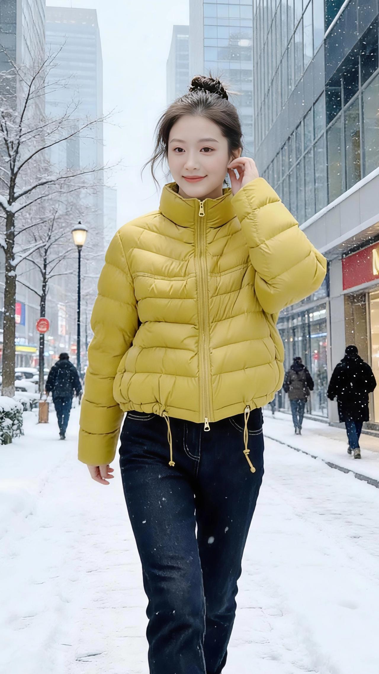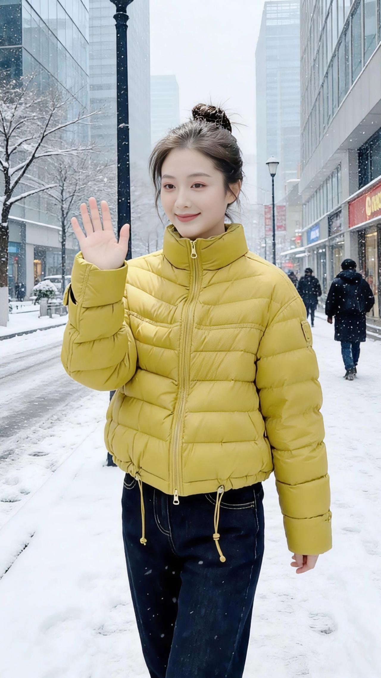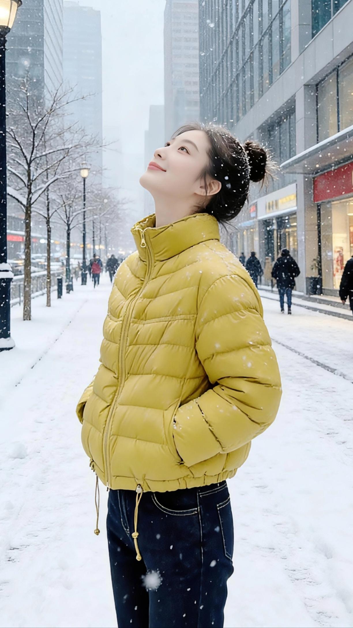 冬阳 雪粒正簌簌地落满摩天楼的玻璃幕墙,她仰起脸,让冰凉的雪片轻吻过眼睑。那件芥末黄的羽绒服裹着她,像一团被阳光晒暖的云朵,在素白的街景里格外鲜亮。 她把双手揣进衣兜,领口的拉链拉得很高,恰好遮住半片下颌。走过街角时,她抬手理了理被风吹乱的碎发,丸子头沾了细碎的雪,像顶了一小捧蓬松的棉絮。 路过橱窗时,她朝玻璃里的自己弯了弯眼,随即又笑着朝镜头挥了挥手。羽绒服的褶皱里积了点雪,她却毫不在意,只顾着踩着松软的雪往前走,脚步轻得像怕惊扰了这满街的冬意。 雪还在下,她的身影却像一小截被点亮的暖烛,在灰蒙的都市里走着,把冬天也走成了温柔的模样。 高级感穿搭 新年穿搭 冬季穿搭 棉衣棉服