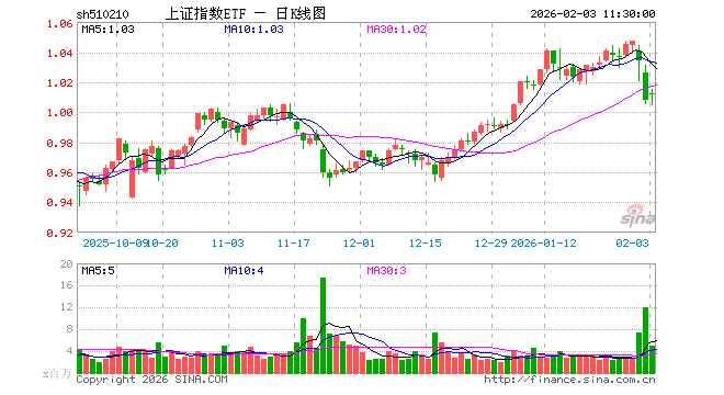 2月3日,截止午间收盘,上证指数ETF(510210)涨0.40%,报1.012元,成交额4.95亿元。上证指数ETF(510210)重仓股方面,农业银行截止午盘跌1.47%,中国石油跌2.62%,贵州茅台涨2.10%,工业富联跌1.44%,中国银行跌2.03%,紫金矿业涨2.76%,中国神华跌1.17%,中国人寿跌0.72%,招商银行跌0.36%,中国平安涨0.42%。