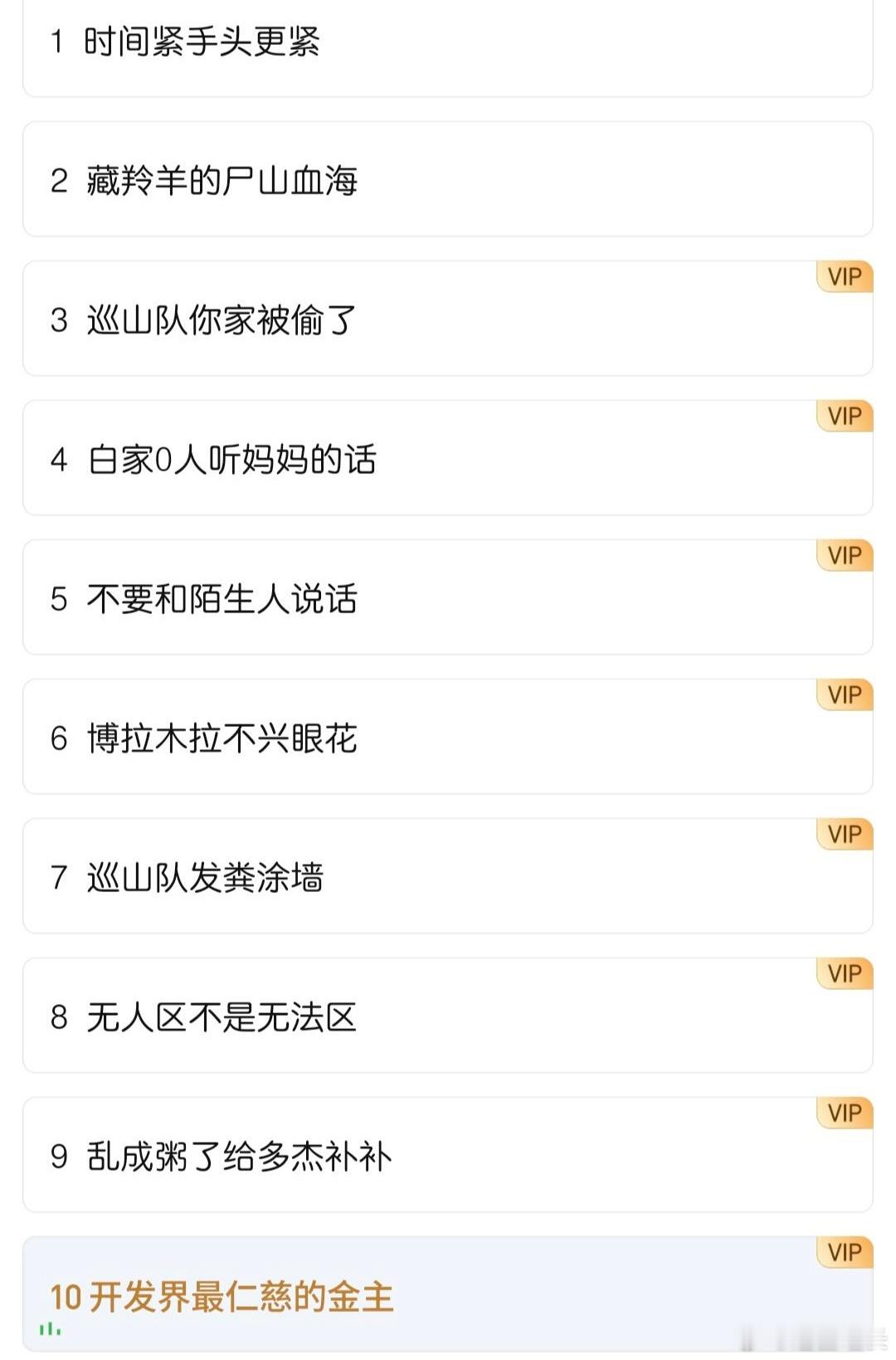 生命树集名是小作文家人们谁懂啊!《生命树》的集名是把整集的抓马都浓缩成梗了吧第一集:时间紧手头更紧开局就精准戳中痛点,项目资金告急、工期又卡得死,开发队和巡山队的矛盾一上来就拉满,直接给后面的冲突埋下伏笔! 第二集:藏羚羊的尸山血海这集名光看就头皮发麻!盗猎者留下的藏羚羊尸体触目惊心,是全剧最震撼的一幕,也让保护的意义瞬间具象化了! 第三集:巡山队你家被偷了巡山队营地遭袭、物资被盗,用“你家被偷了”这种接地气的吐槽,把荒野里的紧张感拉得又好笑又揪心! 第四集:白家0人听妈妈的话白家姐弟俩一个硬刚开发队、一个偏要掺和项目,全员叛逆,完美呼应“0人听妈妈的话”的搞笑吐槽,家庭线也跟着支棱起来了! 第五集:不要和陌生人说话梅婷老师的剧名联动直接戳中童年阴影!对应剧情里陌生人的圈套,既玩梗又点题,这波情怀直接拉满! 第六集:博拉木拉不兴眼花在博拉木拉山口的高原反应里,队员们看花了眼闹出乌龙,用“不兴眼花”的俏皮话,把严肃的荒野日常玩出了笑点! 第七集:巡山队发粪涂墙谐音梗扣大分!巡山队用牛粪糊墙加固营地,又脏又好笑,把高原上的硬核生存写得又真实又有梗。 第八集:无人区不是无法区全剧最硬核的法治台词!面对盗猎和非法开发,这句话直接定调:再偏远的地方也有法律底线,严肃又有力! 第九集:乱成粥了给多杰补补多杰昏迷住院,外面巡山队和白家兄弟已经打成一团,“乱成粥”精准概括鸡飞狗跳的场面,“补补”又带着点心疼的调侃,紧张里藏着笑点! 第十集:开发界最仁慈的金主这位金主不仅出钱支持项目,还主动为保护区做公益,“仁慈”二字实至名归,也让开发与保护的矛盾有了温暖的平衡点!生命树你是懂怎么用标题勾住观众的,今晚继续蹲更新!