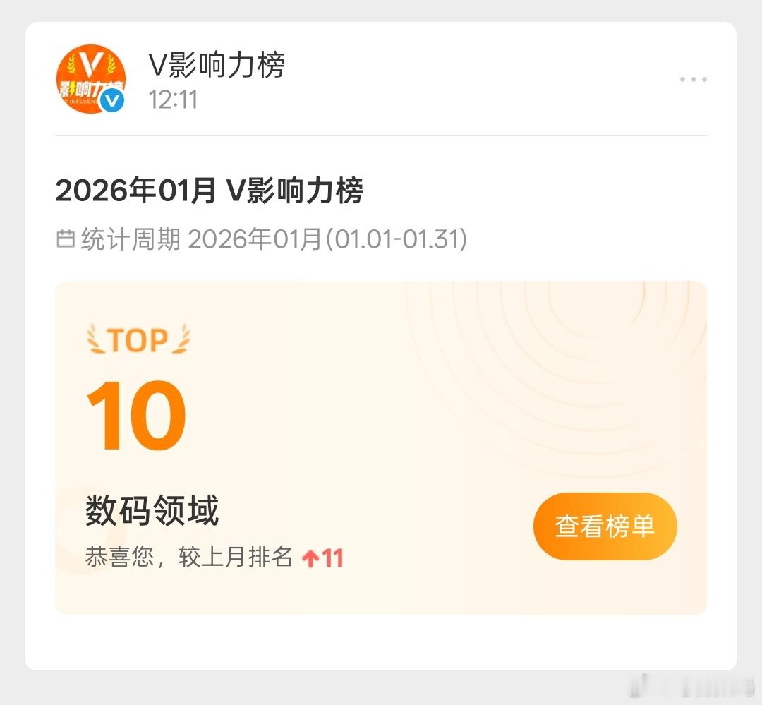 阶段性成果,恭喜毒舌数码2026年1月V影响力榜月榜进入前10。好的开始