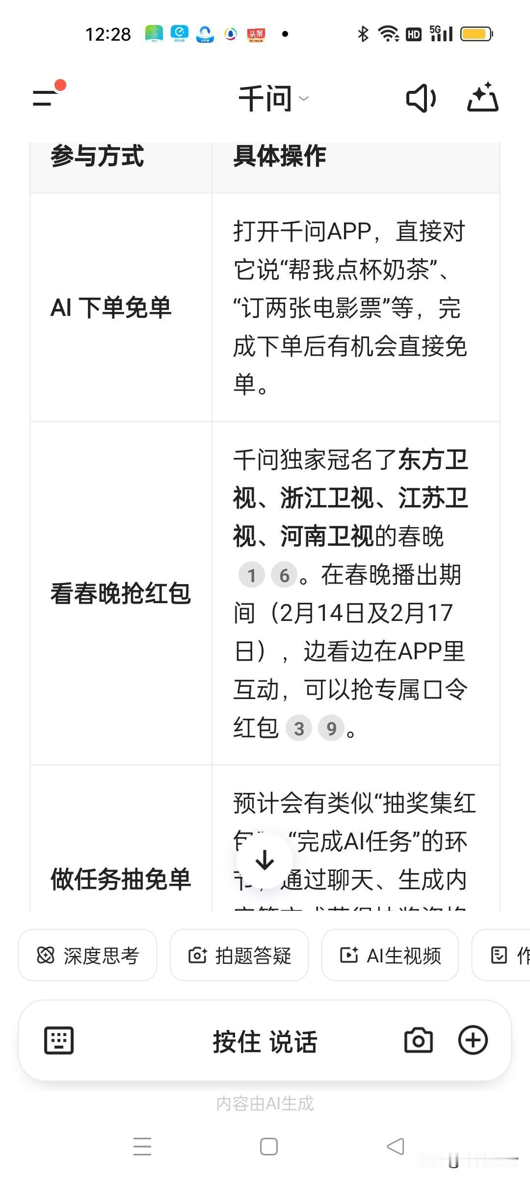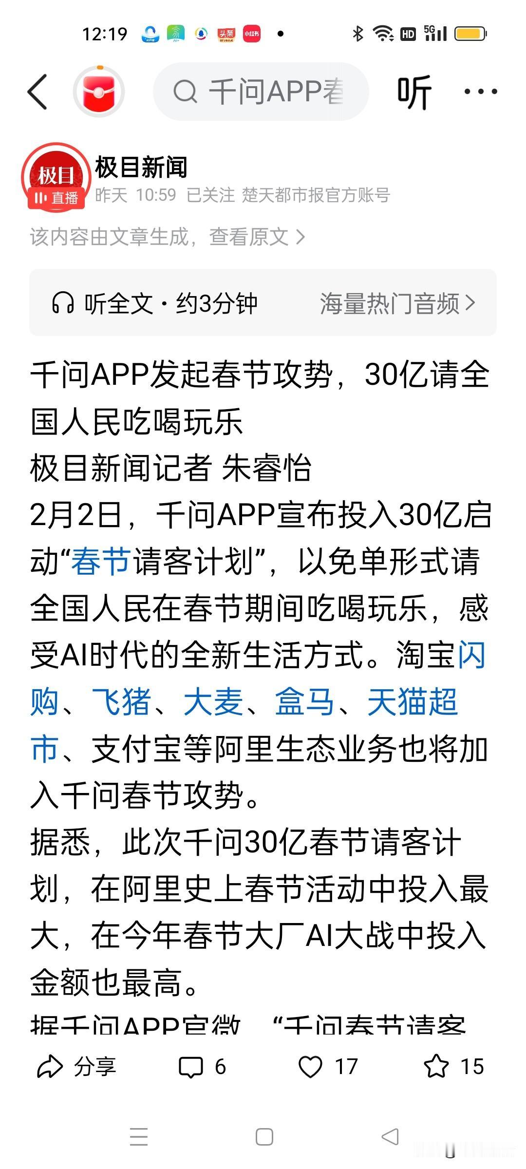 这一刻终于来临了!你敢信吗?一款AI软件要代替很多app的时刻真的来了! 比如现在你的千问app绑定淘宝闪购,你直接可以通过千问点餐,购买电影票,甚至购物,未来会打通阿里巴巴旗下所有app。 刚看到新闻,千问APP投入30亿“春节请客”的消息,搜索一下确实是真的,但这笔钱不是直接发现金,而是以“免单”的形式,帮你报销在吃喝玩乐上的消费 。 这项活动计划于2月6日(也就是后天)正式上线 。为了让你更清楚怎么参与,我把具体的“薅羊毛”方式整理如下: 1. 核心福利:不是发钱,是帮你“买单” 这30亿的玩法和传统的红包不一样,它主打的是“生活办事”。简单来说,就是你用千问APP下单,它帮你免单。 覆盖场景:只要你用千问APP点奶茶、买电影票、订酒店、买机票、买年货(盒马、淘宝闪购等),都有机会免单 。 怎么生效:当你完成下单操作后,系统会自动核销免单资格(如果抽中的话),相当于你不用掏钱,阿里帮你付了 。 2. 普通民众怎么参与?(操作指南) 目前官方尚未公布所有细节规则,但根据现有的信息,你可以通过以下路径参与:(下图中有步骤) 在此之前,只需完成千问与淘宝闪购的账号绑定授权,即可领取千问专享闪购红包🧧! 绑定后,我将成为你的专属外卖助手,为你智能推荐餐品并完成下单,让订餐从此更省钱、更省心。 你就说牛不牛?在一个多月以前,吴晓波跨年演讲中讲AI时代来临,流量时代即将结束的演讲中表示遗憾的是目前国内还没有将AI与生活中的APP联通。没想到阿里率先干了一件大事,而且现在就可以使用! 小伙伴们,现在就去试试点一杯奶茶感受一下科技进步吧!