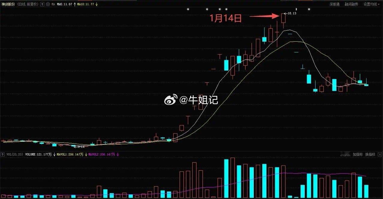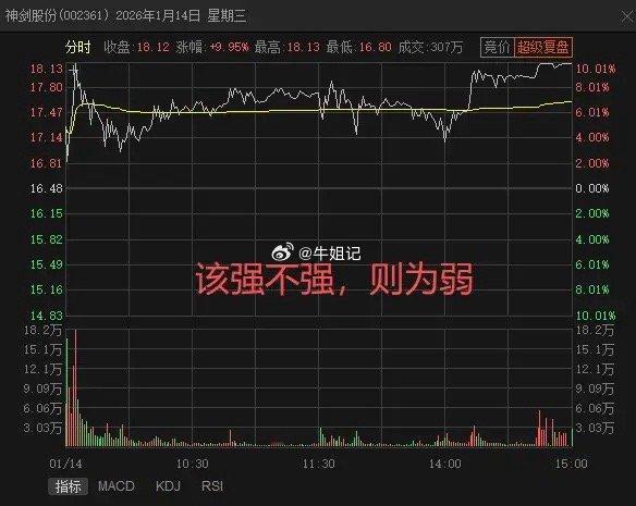 再比如2026年1月14日,神剑股份高开4.98%,开盘超预期了,开盘不久就涨停了,为强。但涨停后很快开板,且开板后盘中长时间震荡,直到尾盘才回封,则为弱。