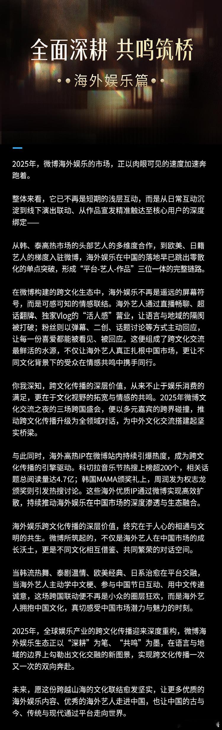 2025微博海外娱乐名场面从粉丝征集活动到520主题互动,微博娱乐白皮书海外娱乐篇总结了多节点、全场景的星粉互动机制。这些实践不断拓展海外娱乐内容在中国市场的参与深度与传播广度。